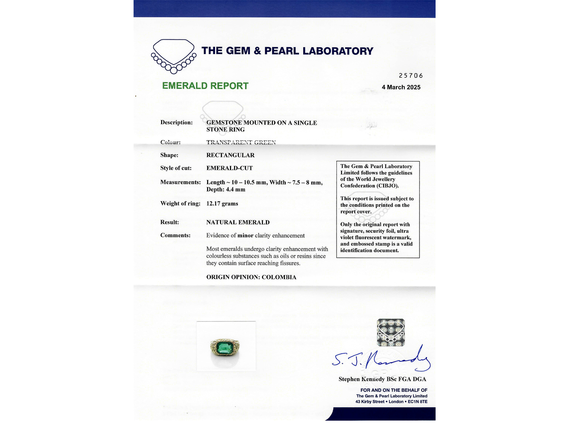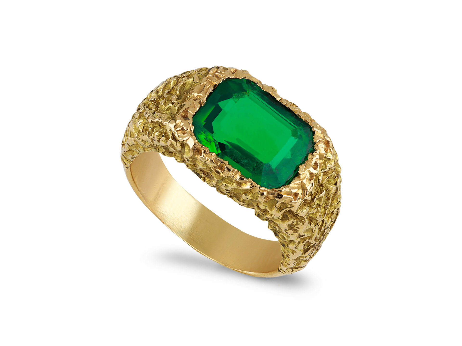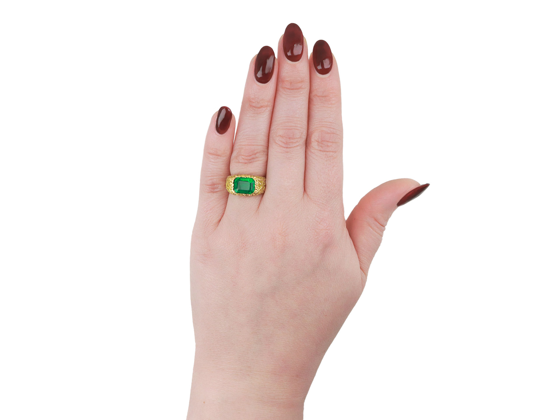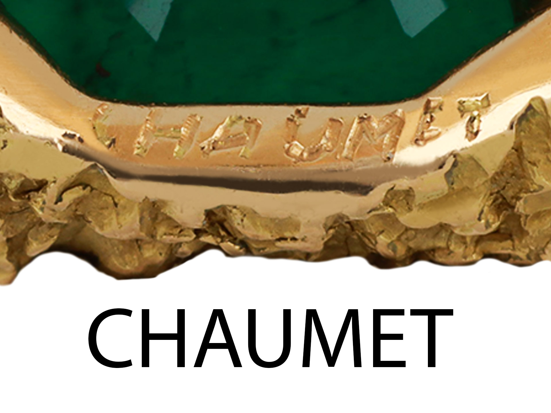 Chaumet Colombian emerald solitaire ring. Set centrally with an octagonal emerald cut natural Colombian emerald with minor clarity enhancement in an open back rubover setting with an approximate weight of 2.40 carats, to an impressive solitaire design featuring textured metalwork throughout, with trumpeting shoulders that lead to a solid D-shape shank. Tested yellow gold, signed 'Chaumet', indistinct maker's mark, circa 1965, accompanied by The Gem & Pearl Laboratory report #25706.