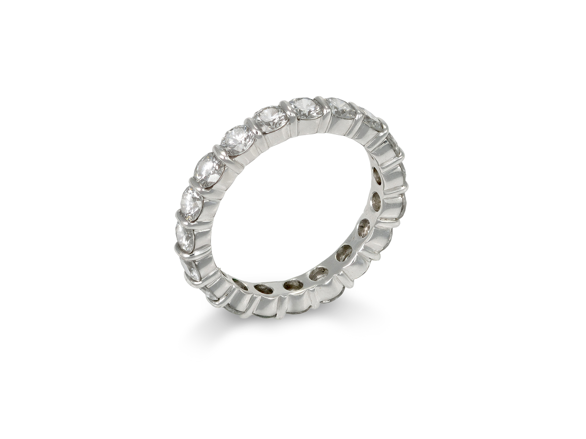 Kutchinsky diamond full eternity ring. Set with nineteen round transitional cut diamonds in open back part-rubover settings with a combined approximate weight of 2.75 carats, featuring polished metalwork, a ridged gallery and round open backholing, approximately 3.5mm in width. Tested white gold, English, 1985, accompanied by original box and copy of original (redacted) sales receipt dated from 1985.