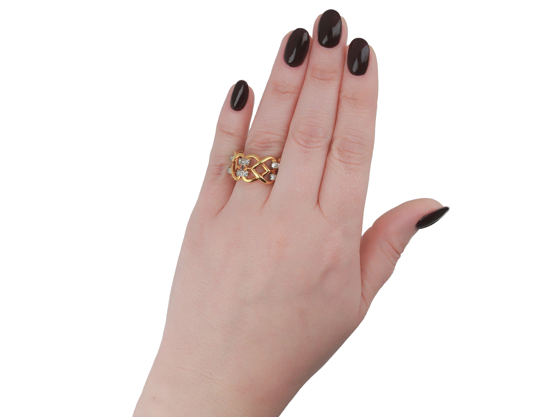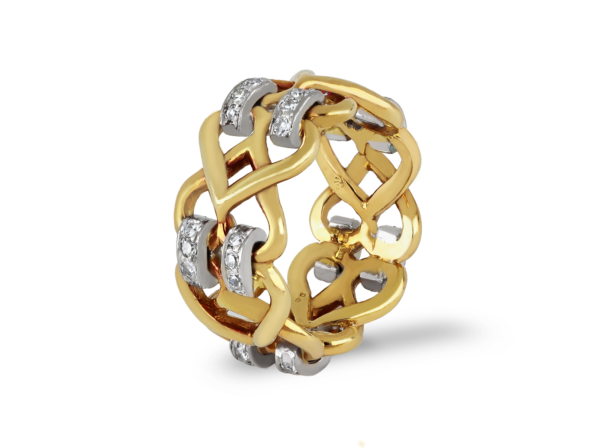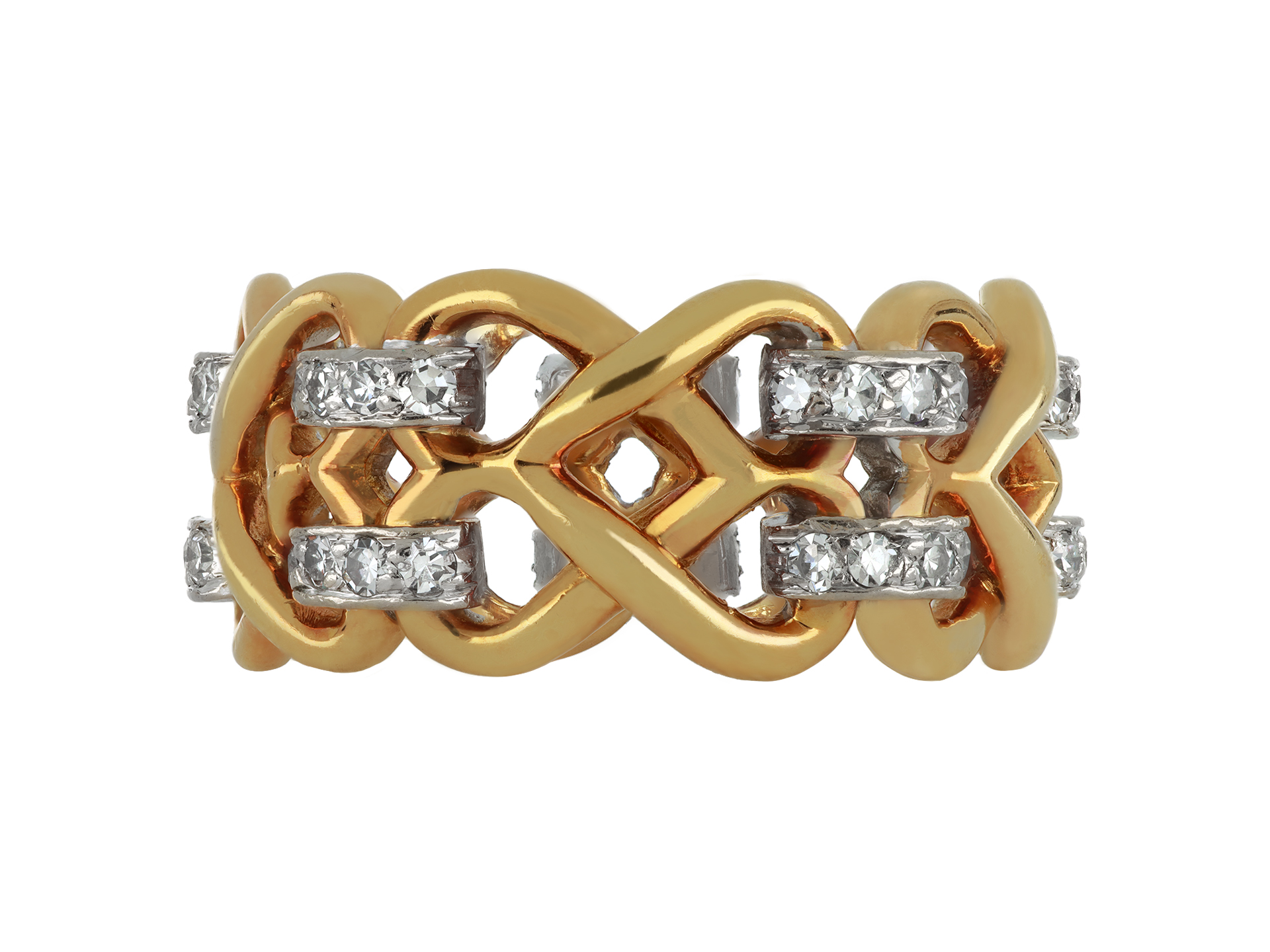 Kutchinksy diamond knot ring. Set with 50 round eight-cut diamonds in closed back grain settings with a combined approximate weight of 1.00 carats, to an intricate openwork design, featuring woven links and polished edges. Marked 18 carat gold, maker's mark for Kutchinsky, full hallmarks for London, English, 1976.