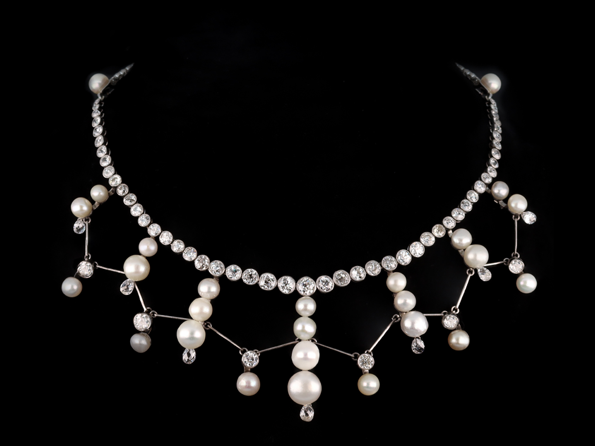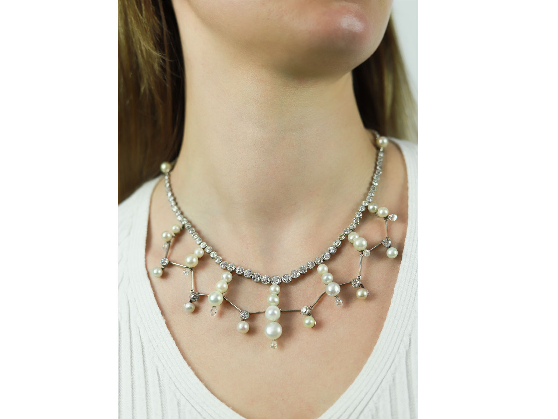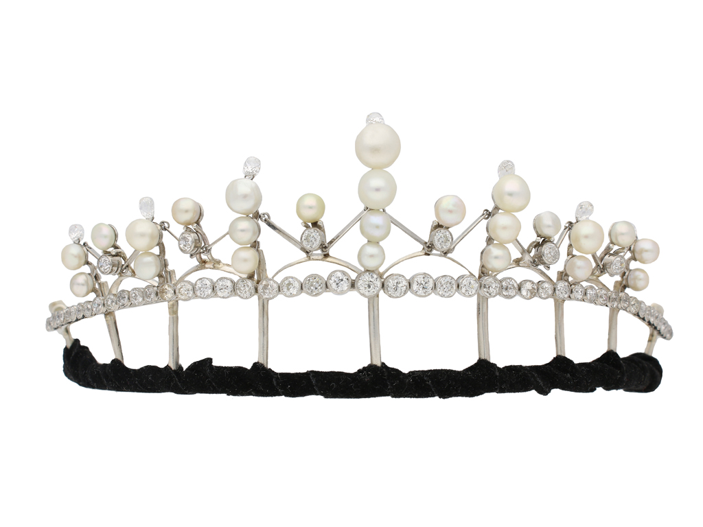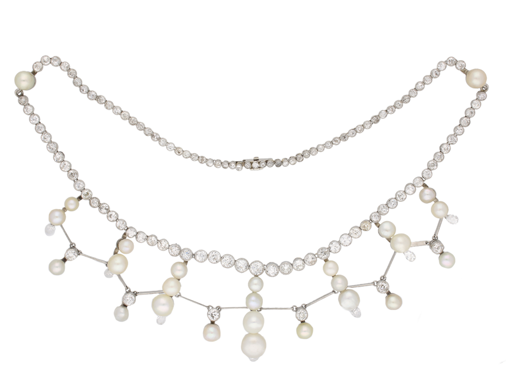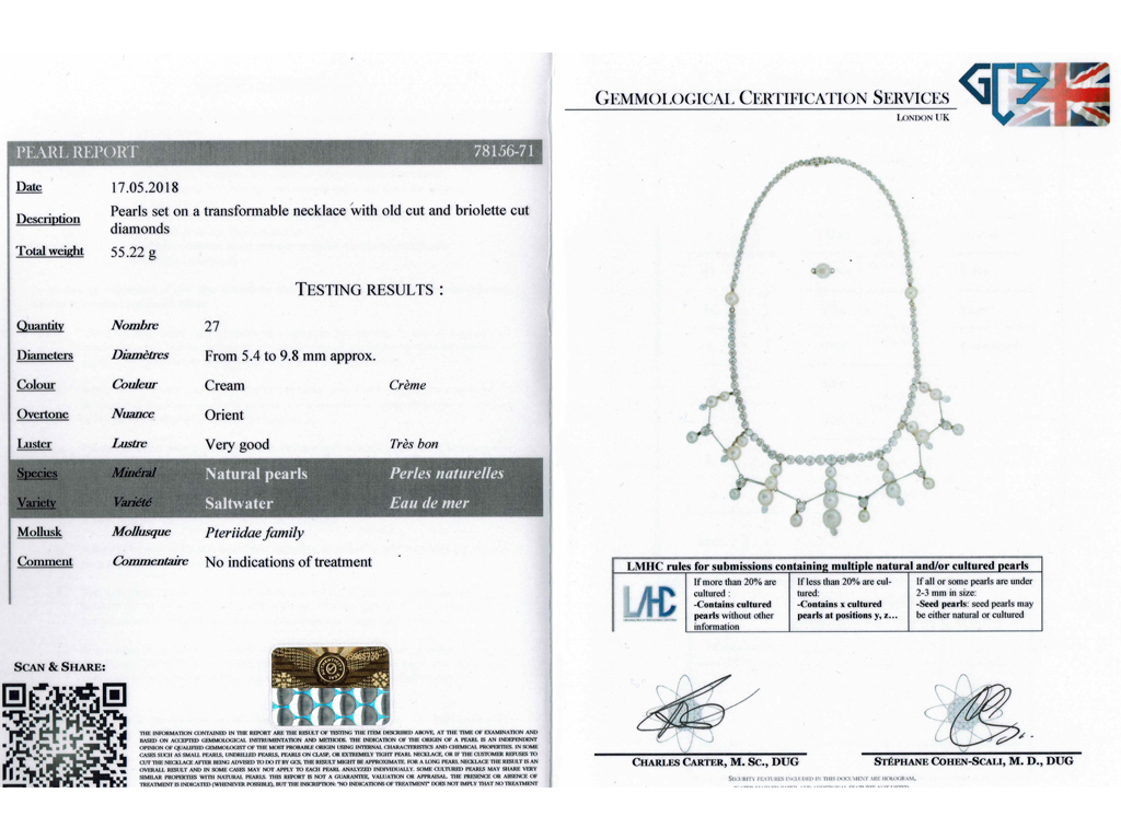 Natural pearl and diamond tiara/necklace/bracelet. Set with twenty seven round natural saltwater pearls, approximately 9.8 to 5.4 mm in diameter, further set with six round old cut diamonds in open back rubover settings with a combined weight of 2.40 carats, embellished with seven drop shape briolette cut diamonds in bead settings with a combined weight of 4.00 carats, further set with one hundred and seven round old cut diamonds in open back rubover settings, fifty one forming the tiara band, fifty six forming the bracelet, with a combined weight of 21.70 carats. The total approximate diamond weight is 27.90 carats, to an impressive articulated necklace, featuring fringes of graduating pearls interspersed between festoons of pearl and diamond highlights, the diamond set band of the necklace composed of a front and rear section, joined together with slipper hooks, further set with a natural pearl on each side, the diamond set band continuing to reverse and terminating with a secure push clasp with safety catch, with millegrain borders and collets featuring openwork galleries and circular backholing, necklace approximately 17" in length, featuring a removable front-facing section which converts to an elegant openwork tiara with black velvet lined tiara frame, approximately 6.3cm in height at highest point, reverse-facing removable section forming a bracelet with a centerpiece of three natural pearls and with secure push clasp and safety clasp, bracelet approximately 8.3" in length. Tested platinum, circa 1920, accompanied by Gemmological Certification Services report #78156-71 and fitted black box.