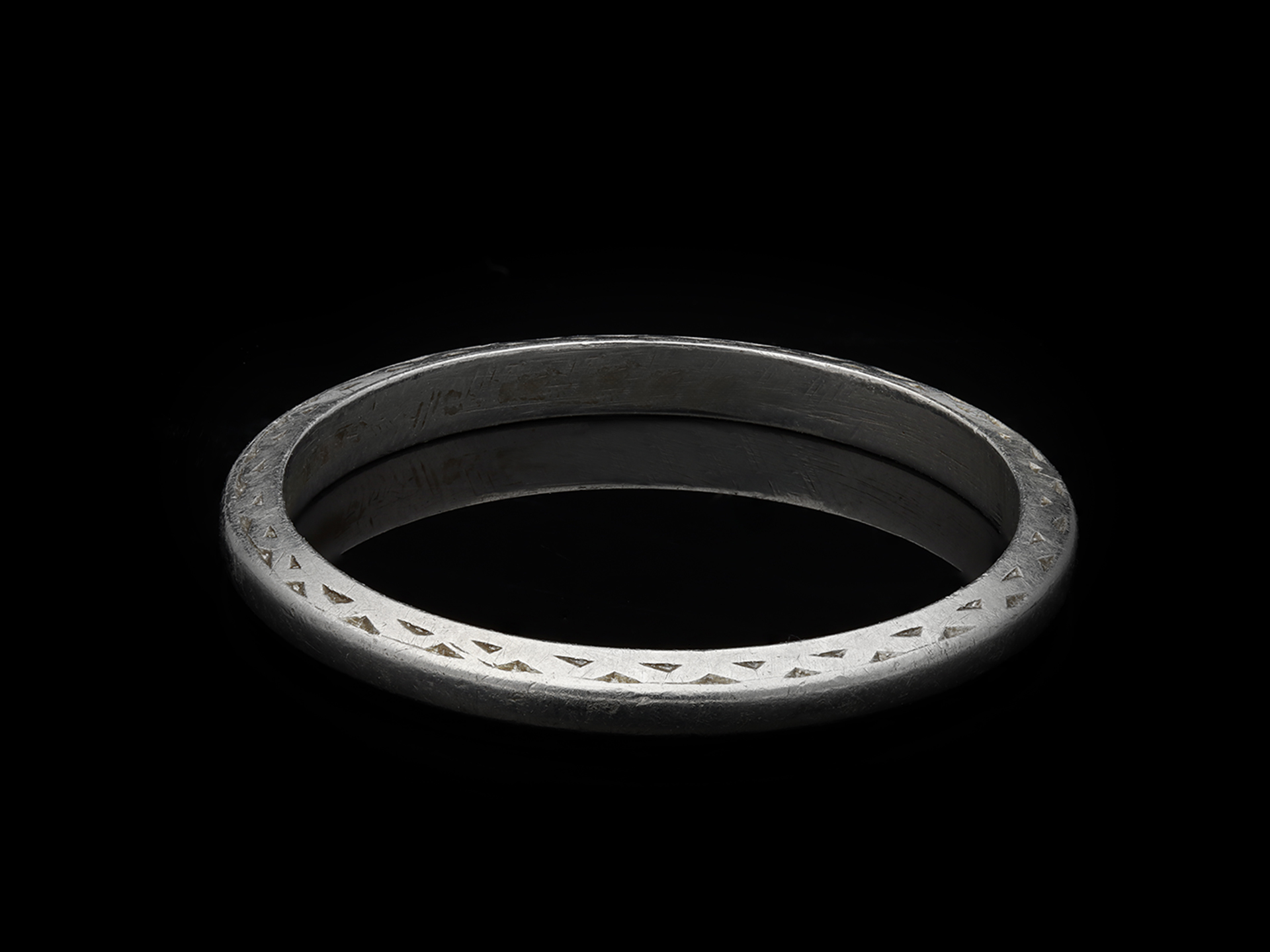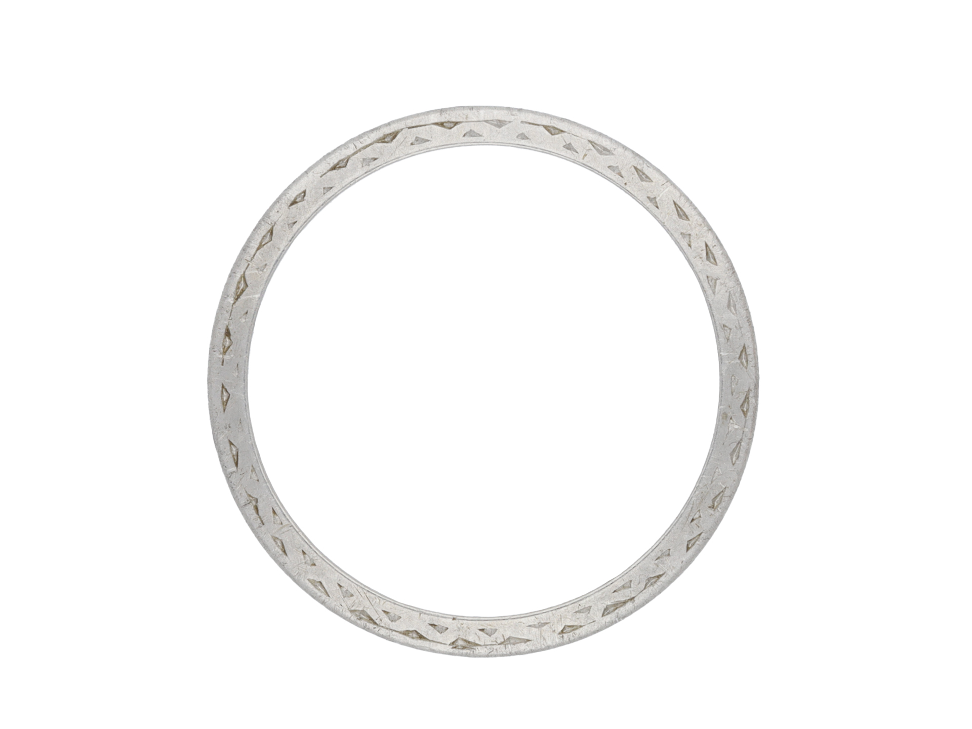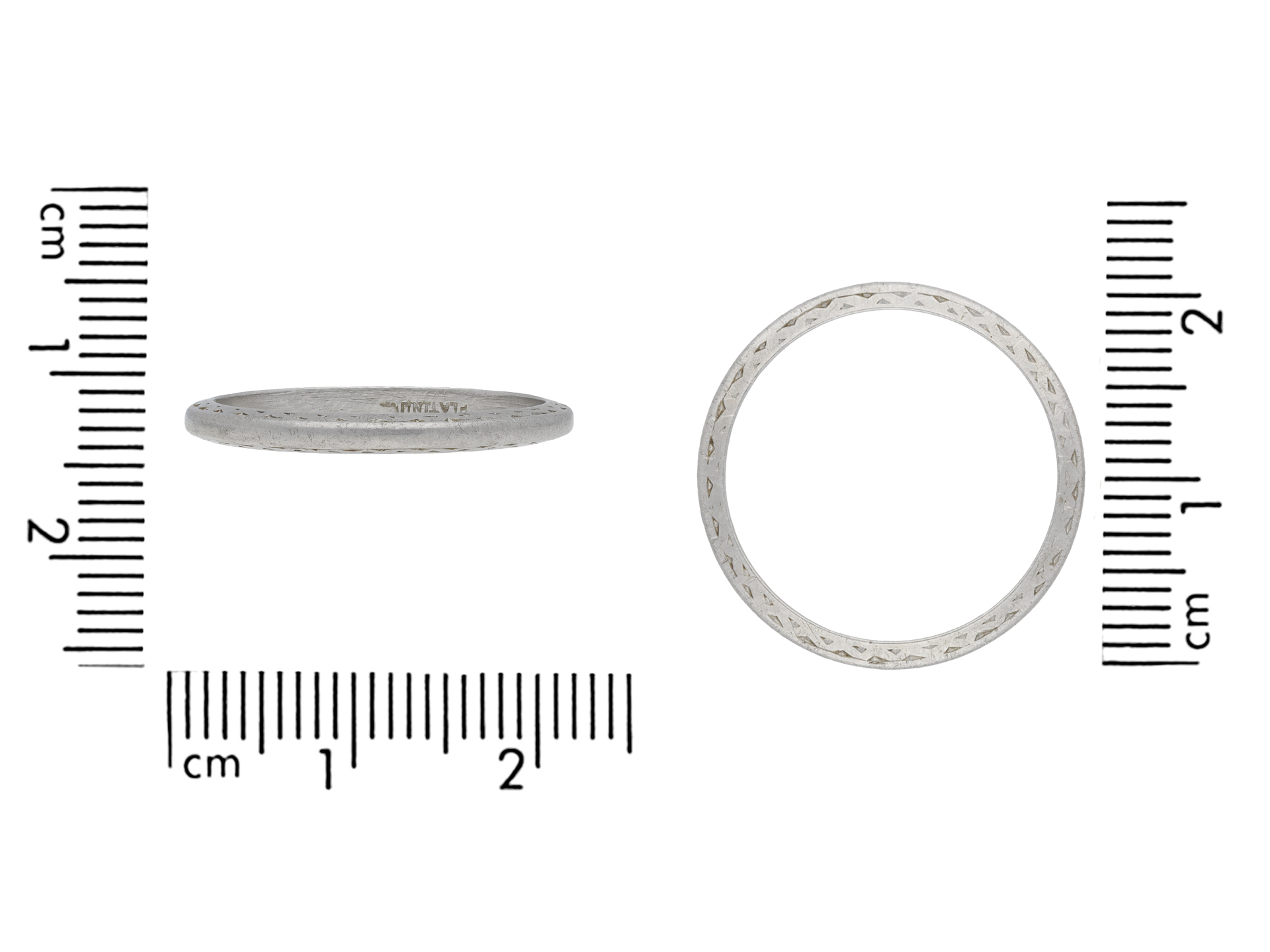 Engraved platinum wedding band. A smooth conforming band, lightly engraved around the full circumference with a repeating gemetric design, approximately 2mm in width. Marked platinum, approximately 2.63 grams in weight, circa 1930.