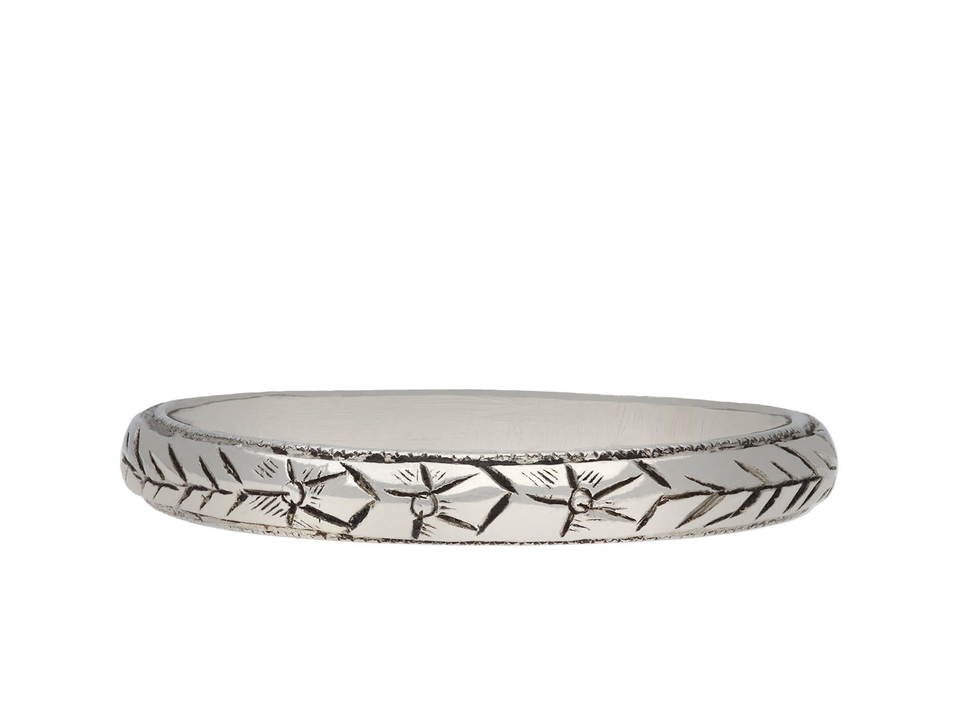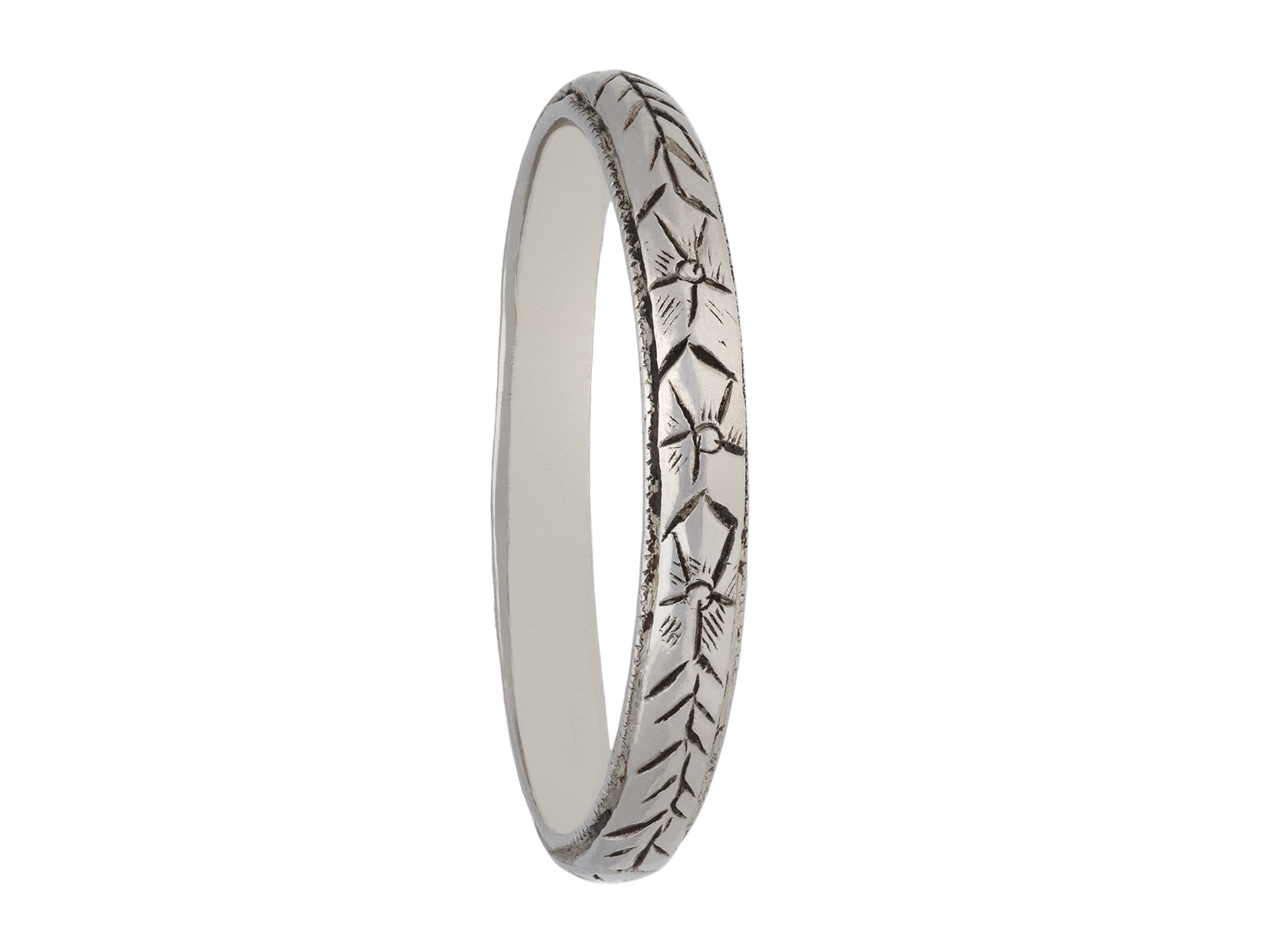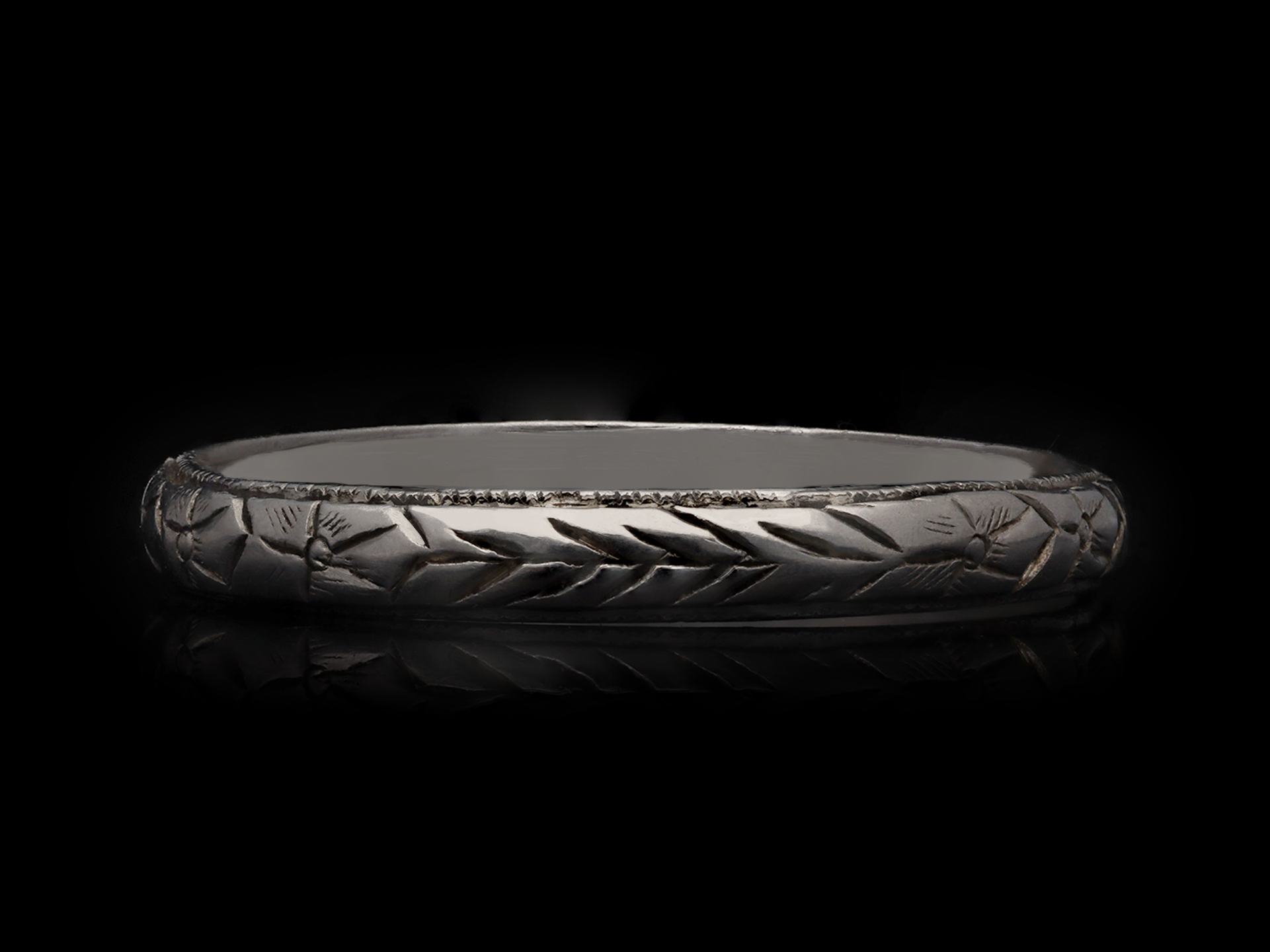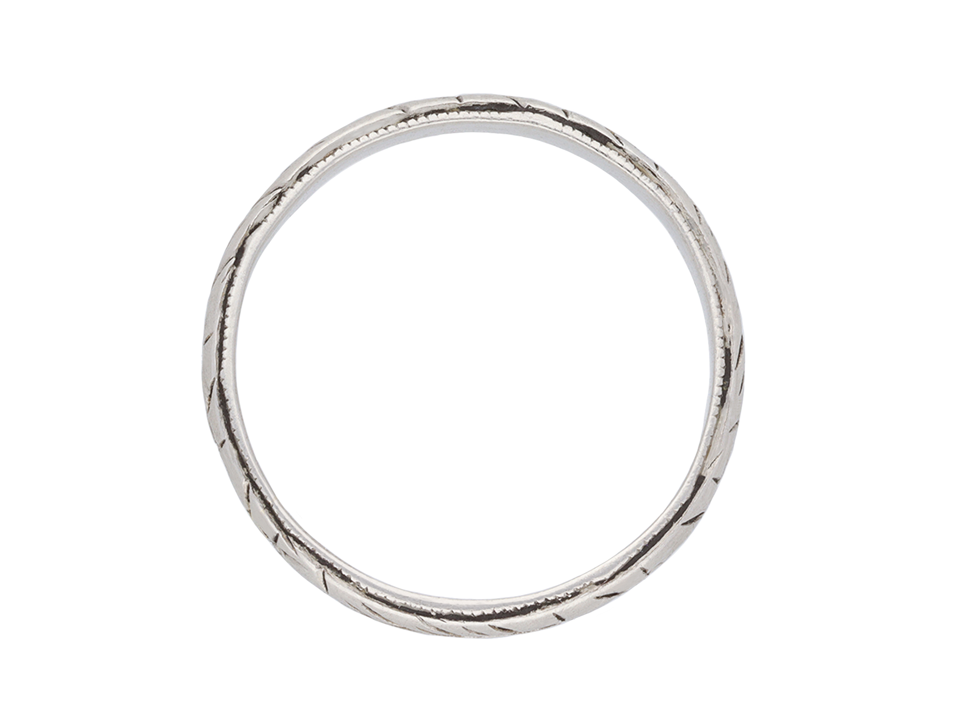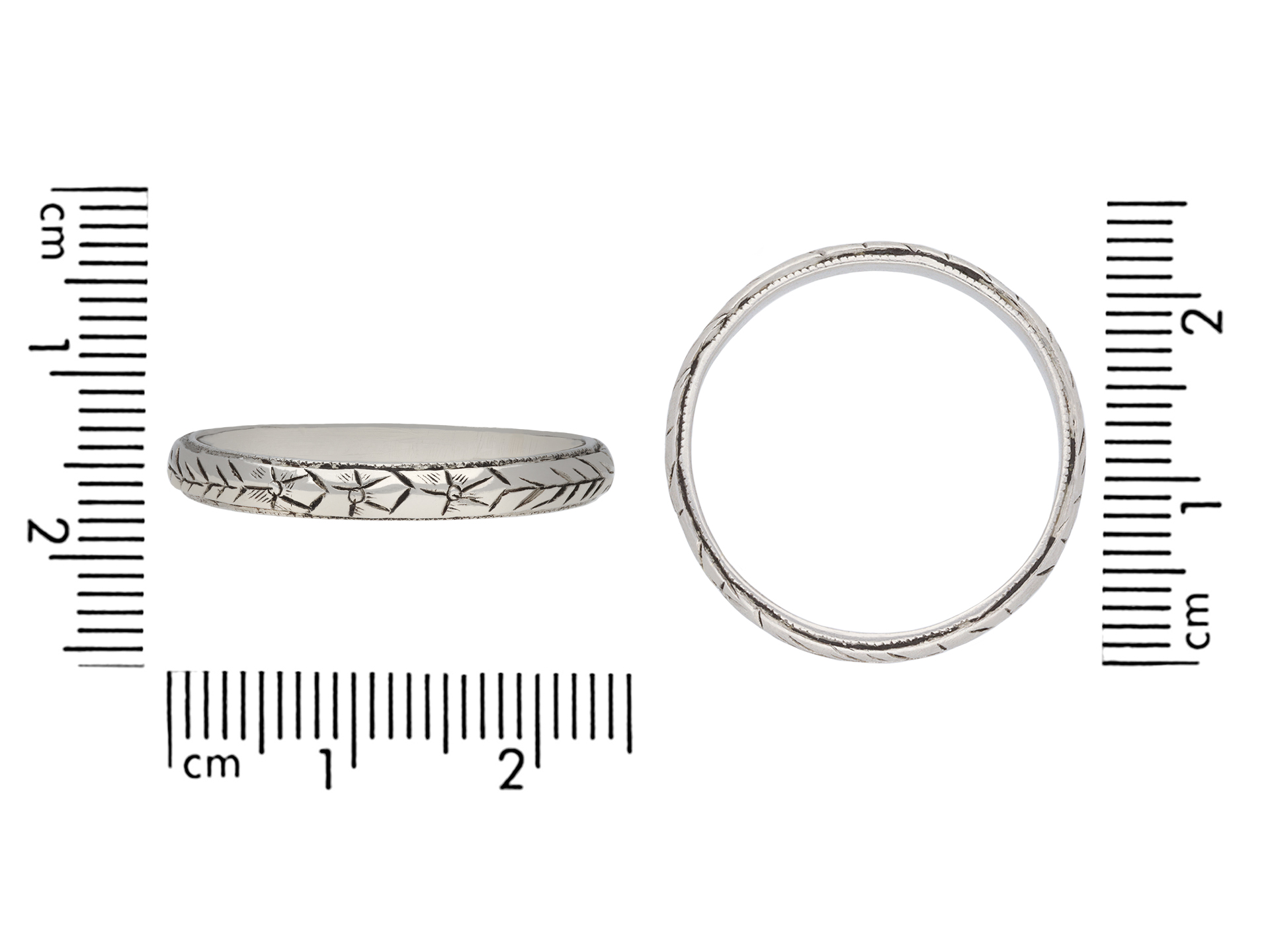 Engraved platinum wedding band. A smoothly conforming D-shape wedding band featuring a engraved linear pattern, approximately 2.5mm in width. Marked platinum, approximately 3.01 grams in weight, circa 1920.