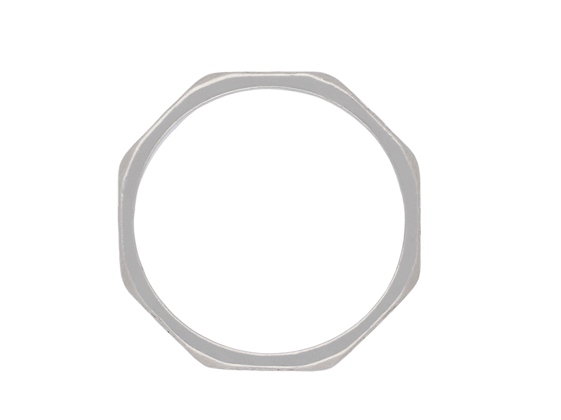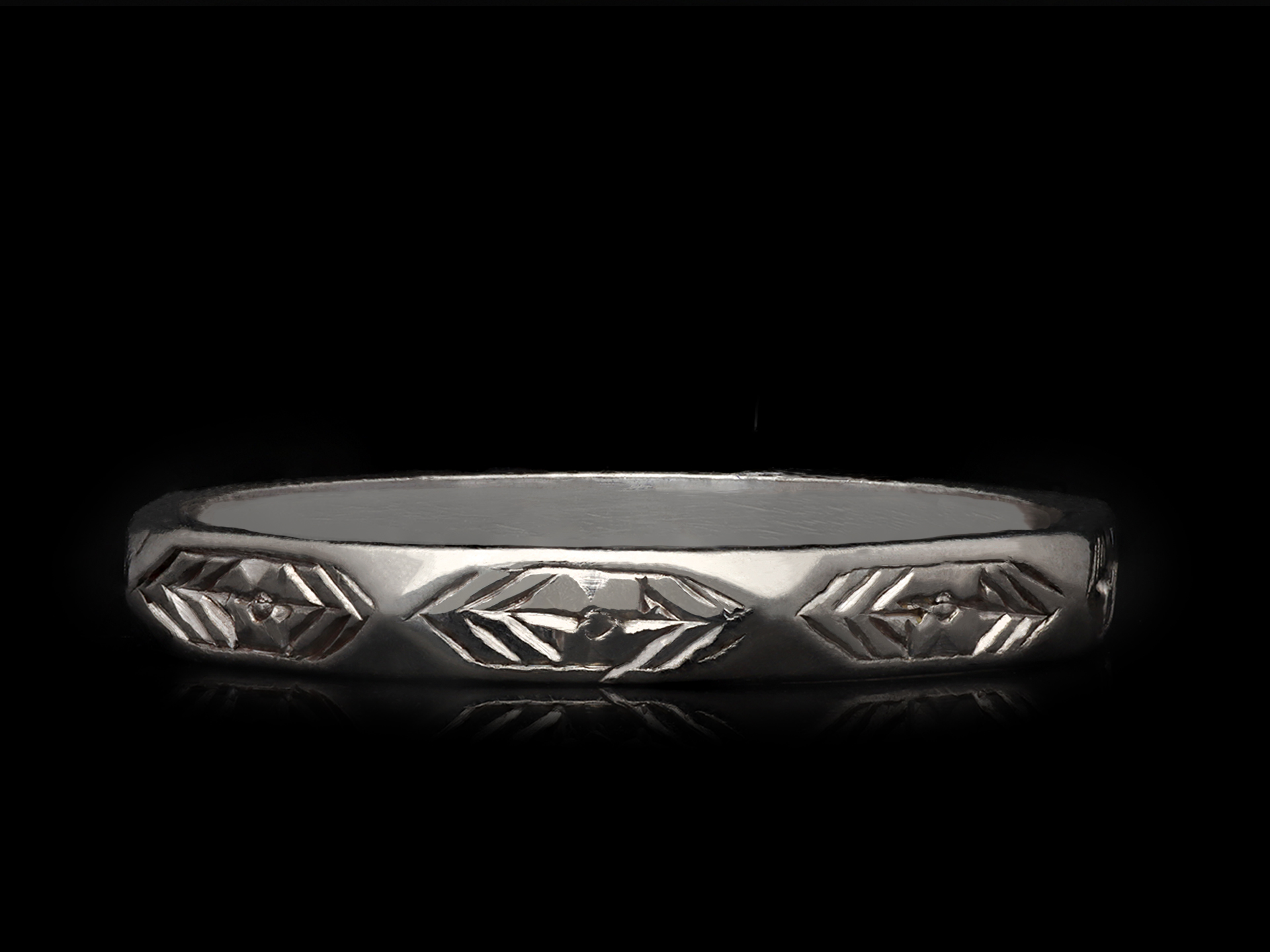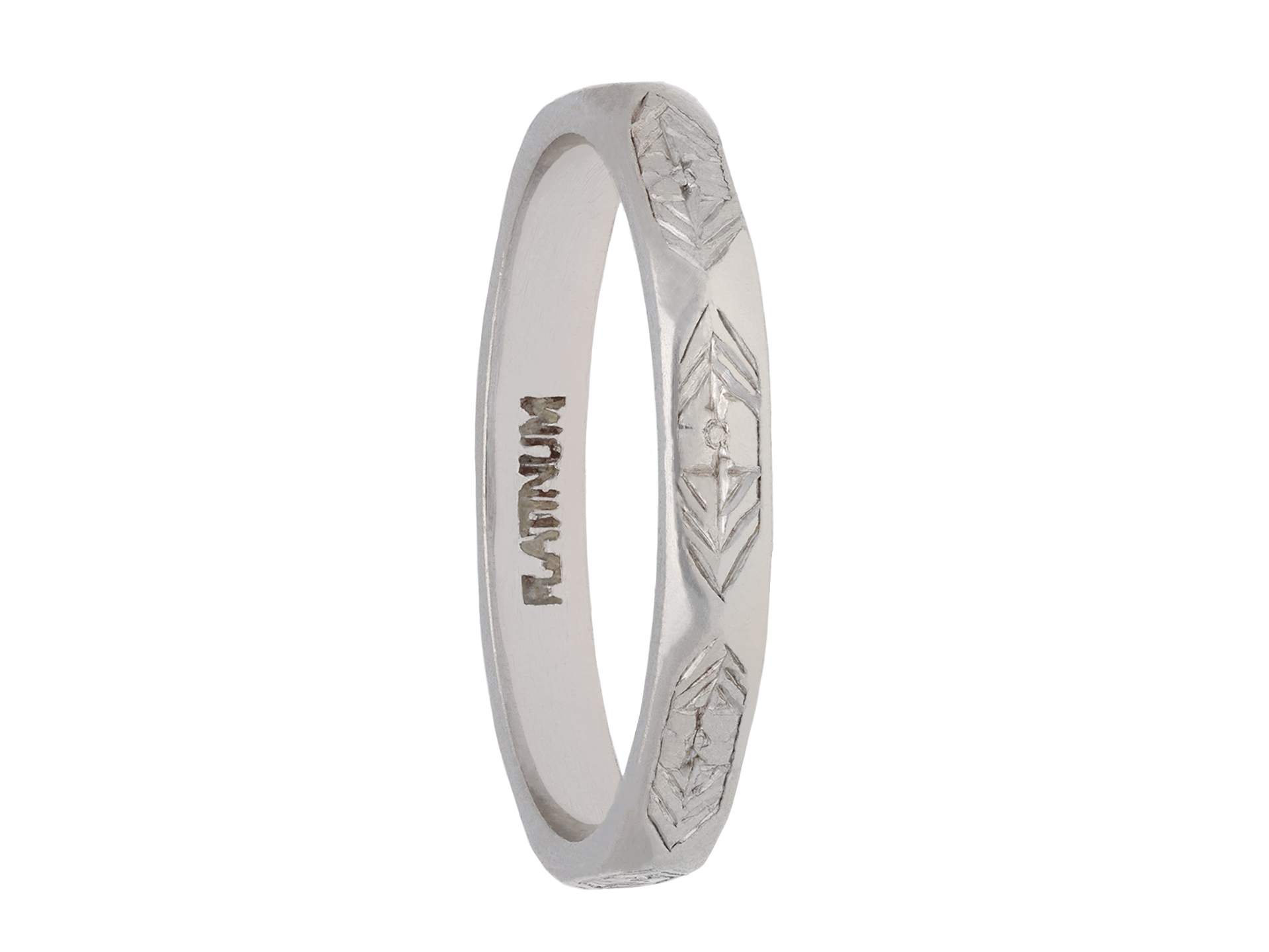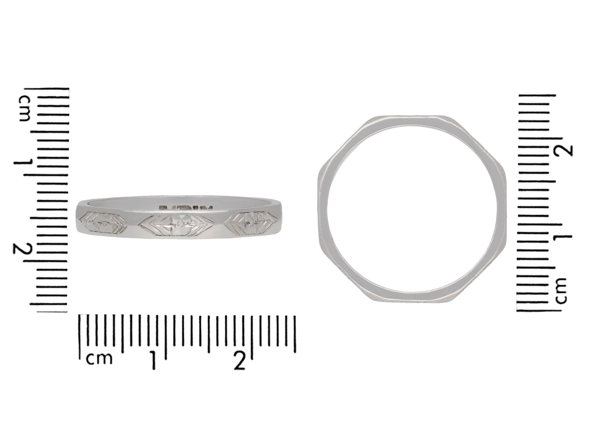 Engraved platinum wedding band. An angular wedding band with octagonal outline, faceted around the full circumference, each panel finely engraved with a repeating stylised foliate design, approximately 2.5mm in width. Marked platinum, approximately 2.84 grams in weight, circa 1930.