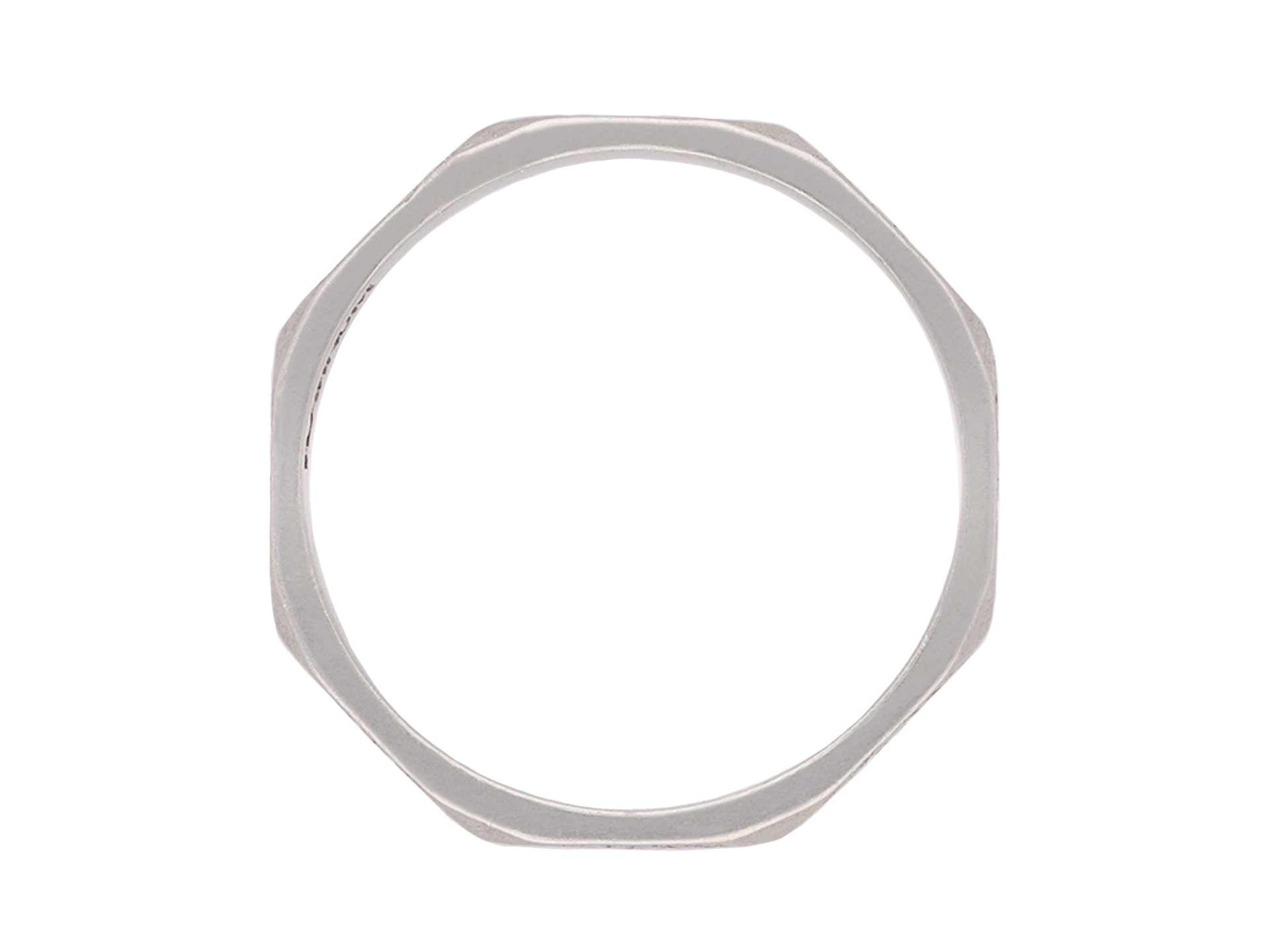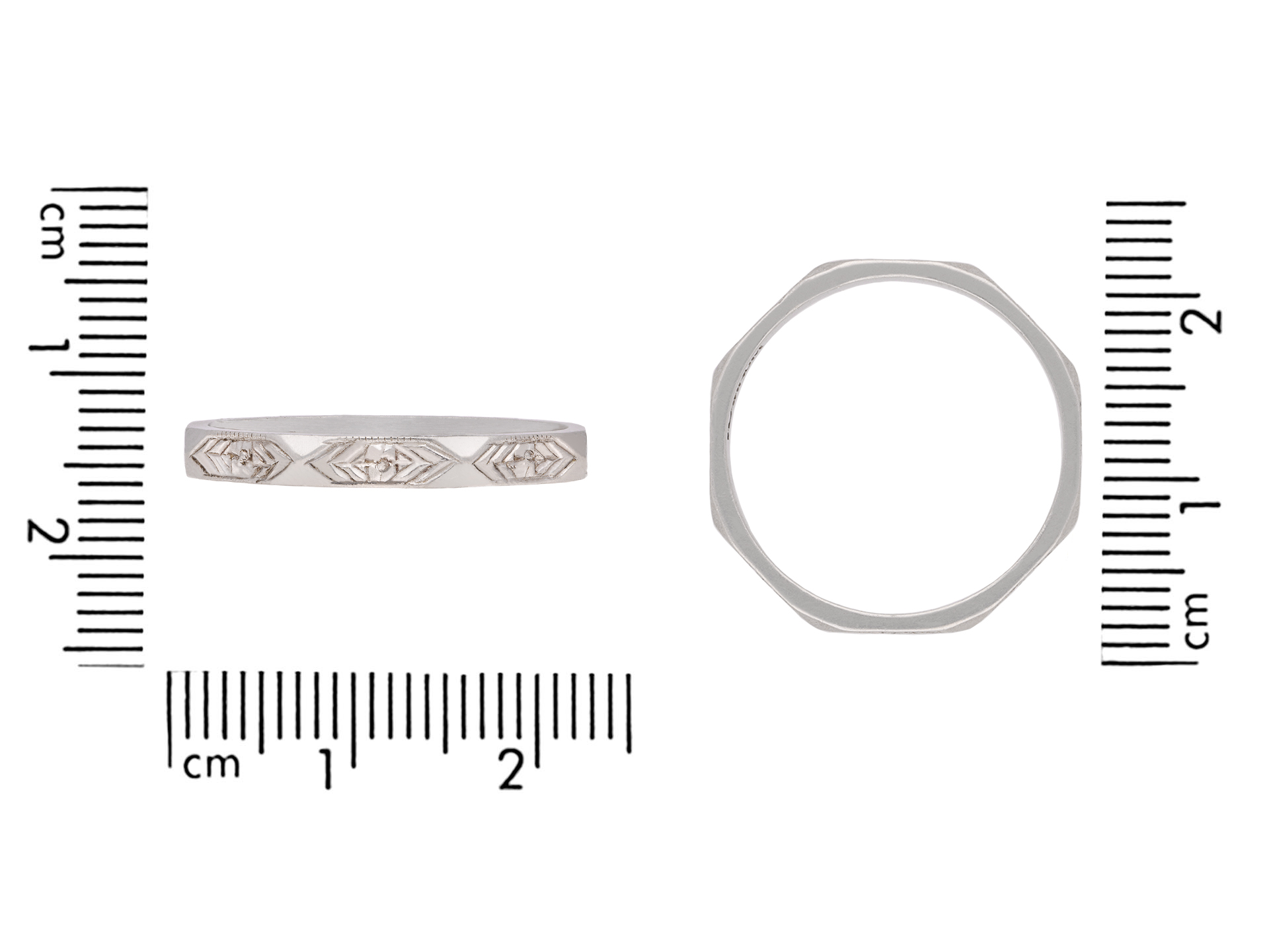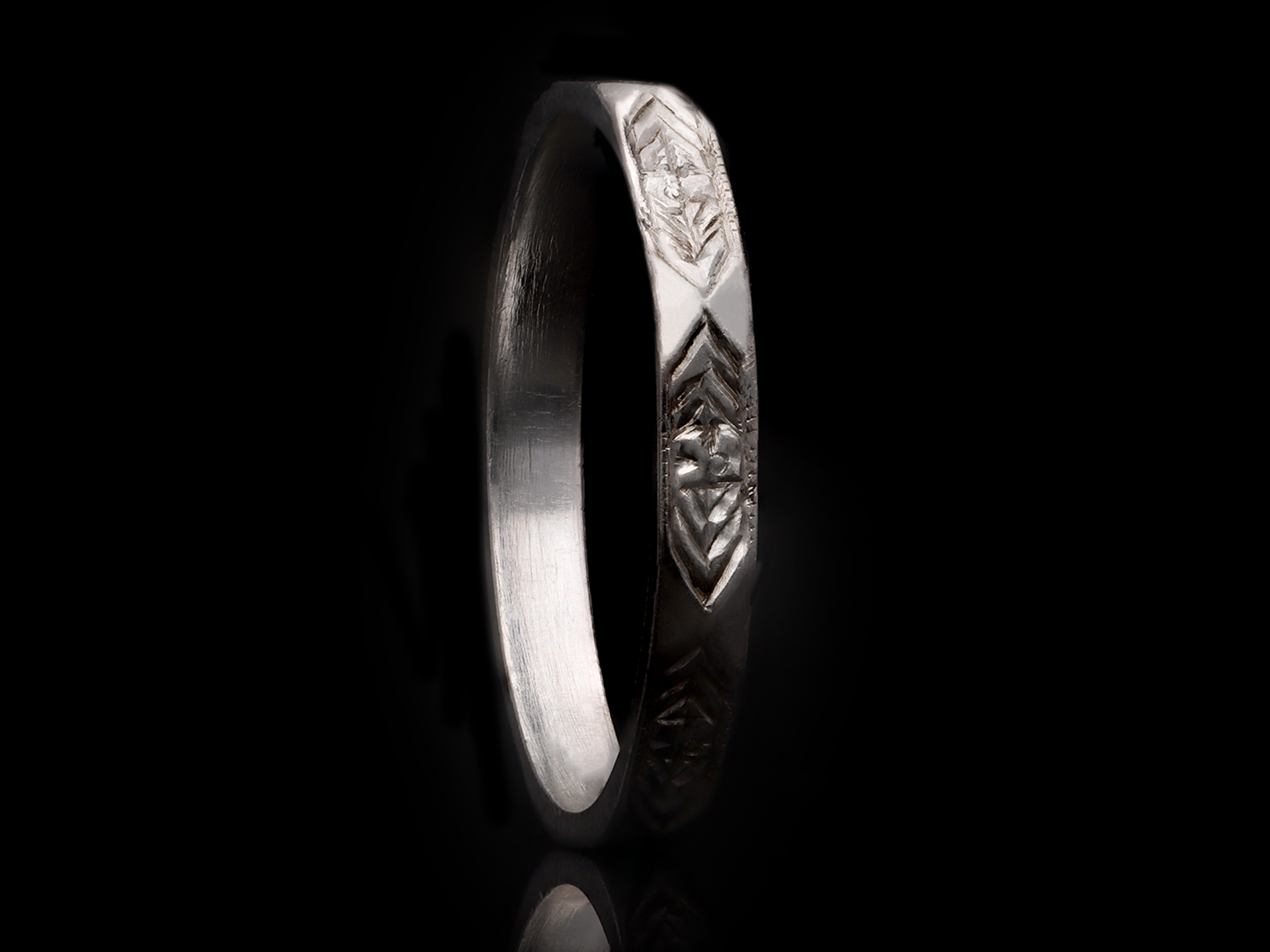 Engraved platinum wedding band. An angular wedding band faceted around the full circumference, each panel finely engraved with a repeating stylised foliate design, approximately 2.5mm in width. Marked platinum, approximately 3.04 grams in weight, circa 1930.
