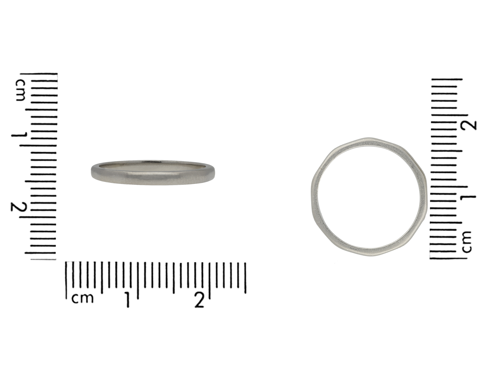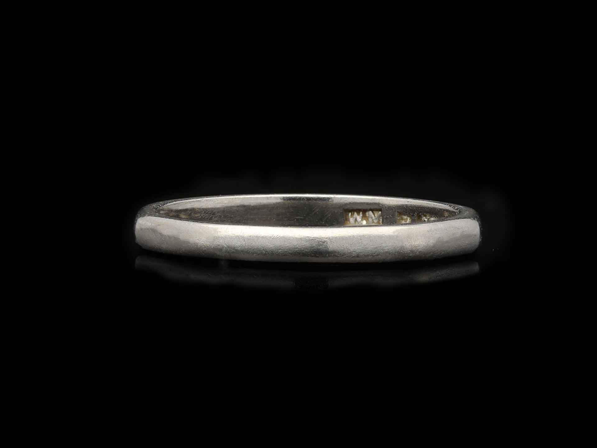 Faceted platinum wedding band. A smoothly conforming band featuring raised faceted details with polished edging, approximately 2mm in width. Marked platinum, approximately 2.54 grams in weight, makers mark 'W.M' for William Manton, circa 1930.