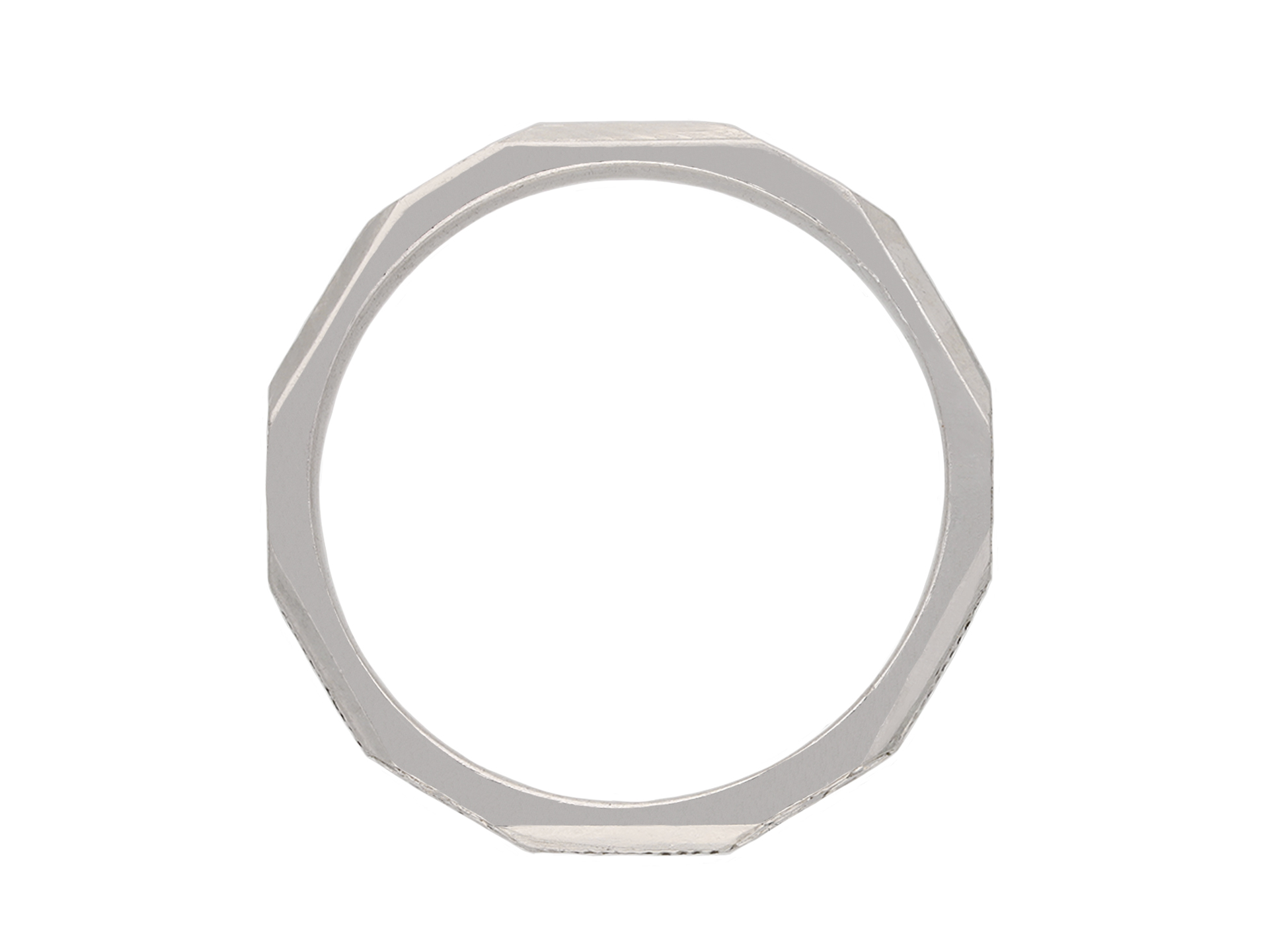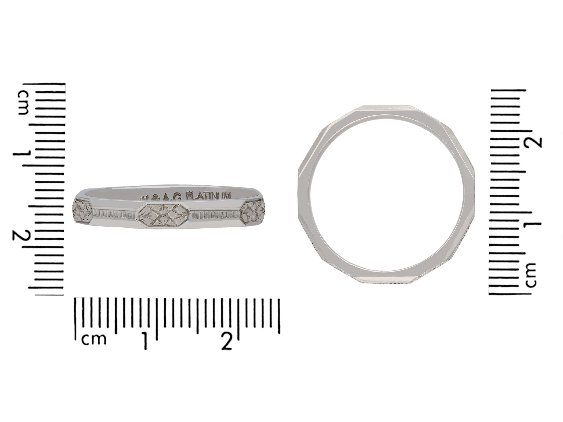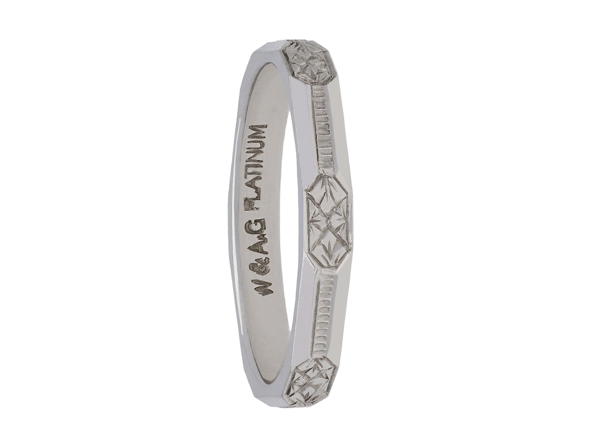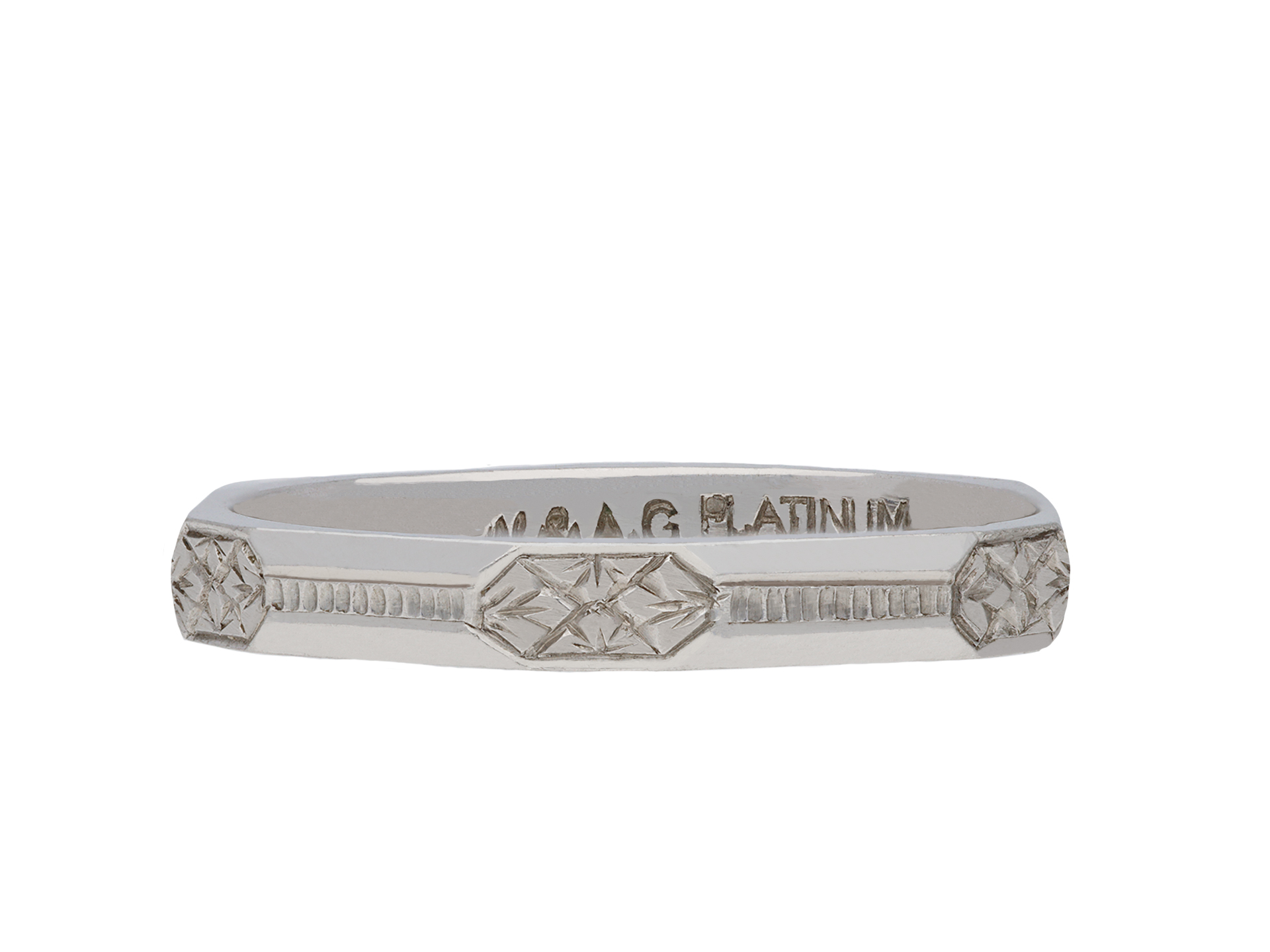 Platinum engraved wedding band. An angular wedding band, faceted around the full circumference, each panel finely engraved with a repeating stylised foliate and linear design, approximately 2.5mm in width. Marked platinum, approximately 3.25 grams in weight, makers mark 'W&A.G', circa 1930.