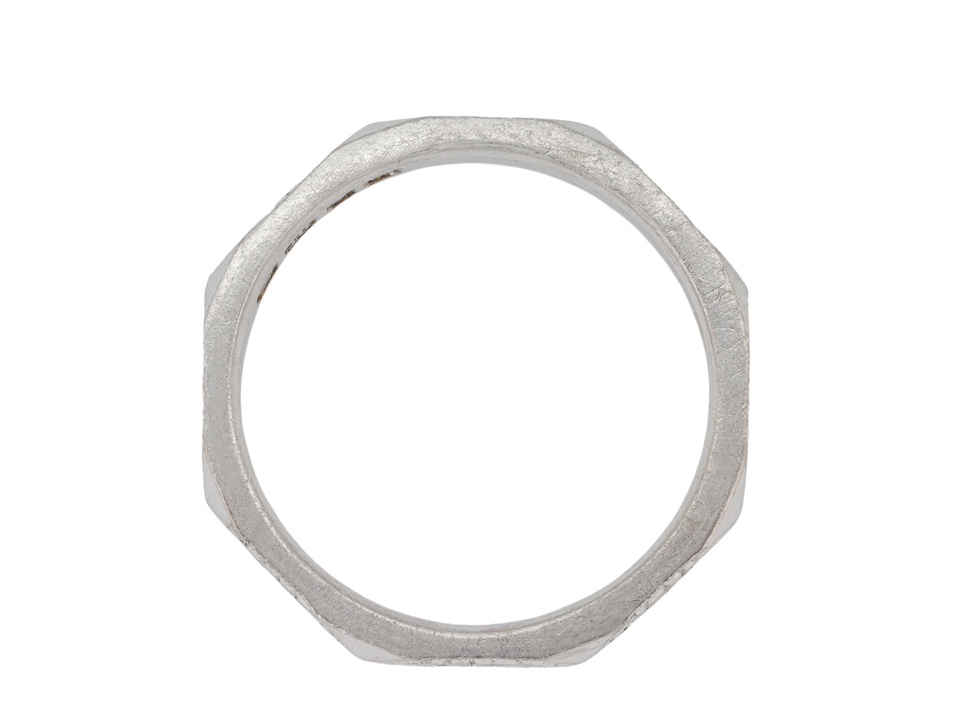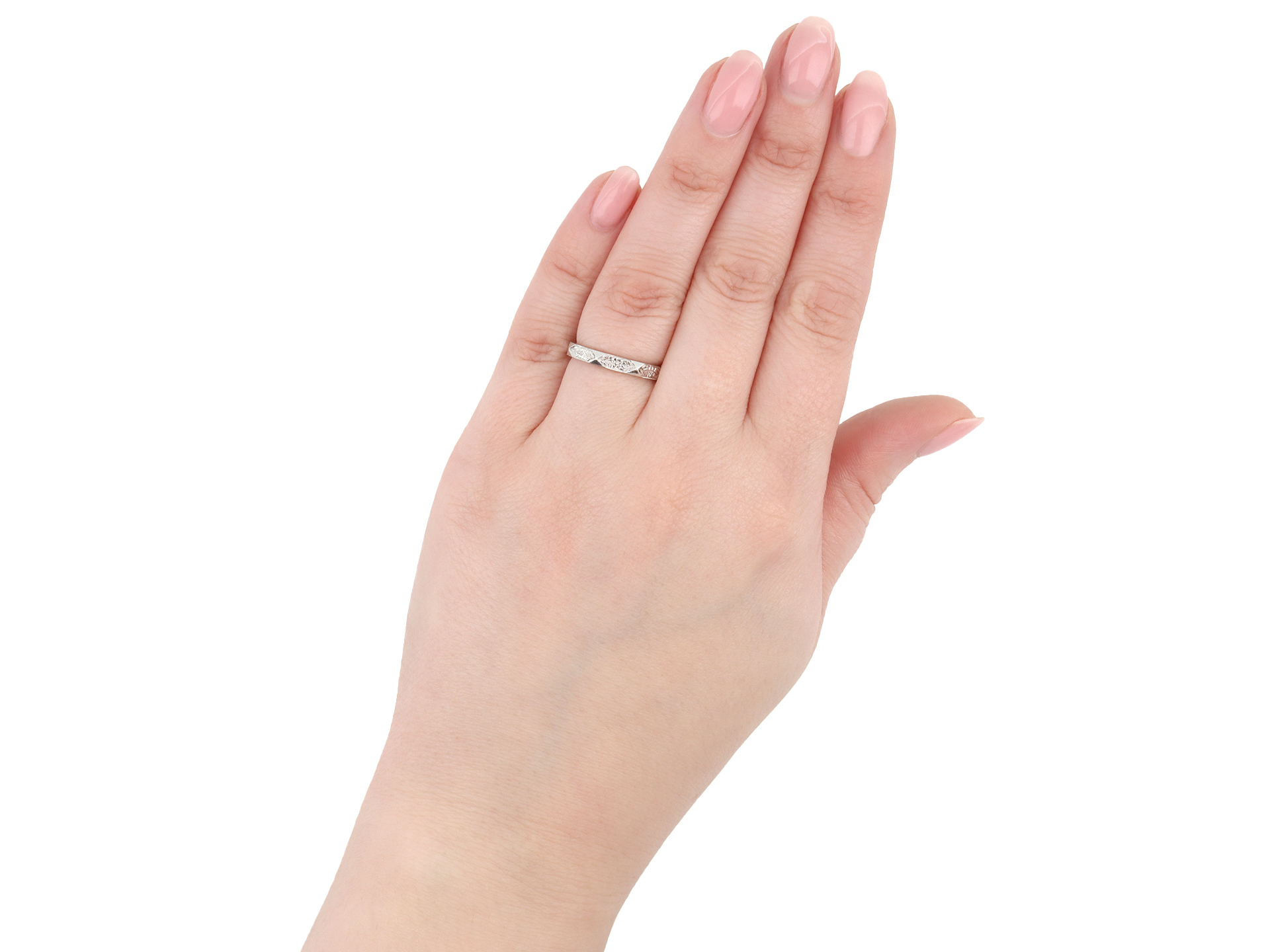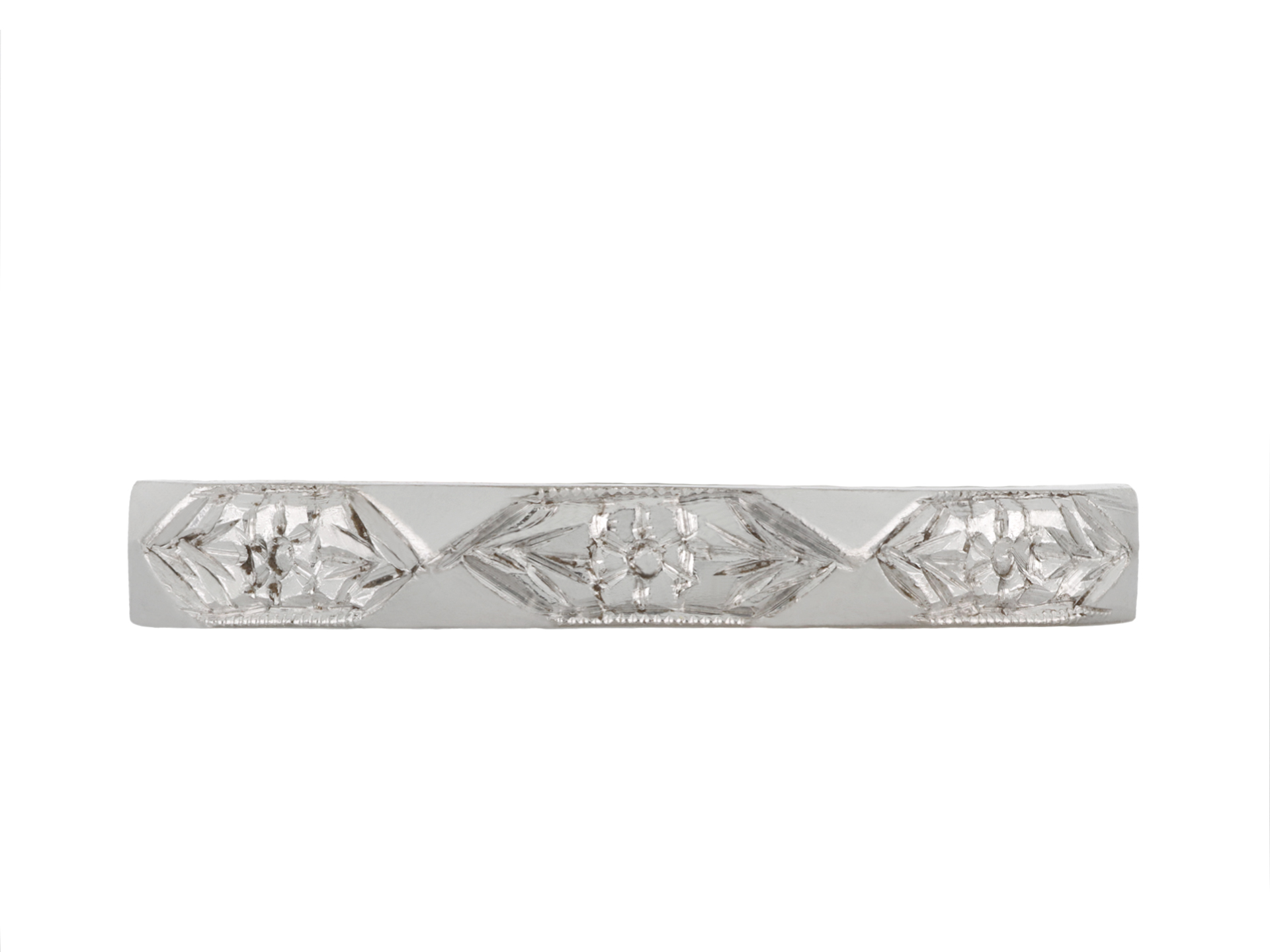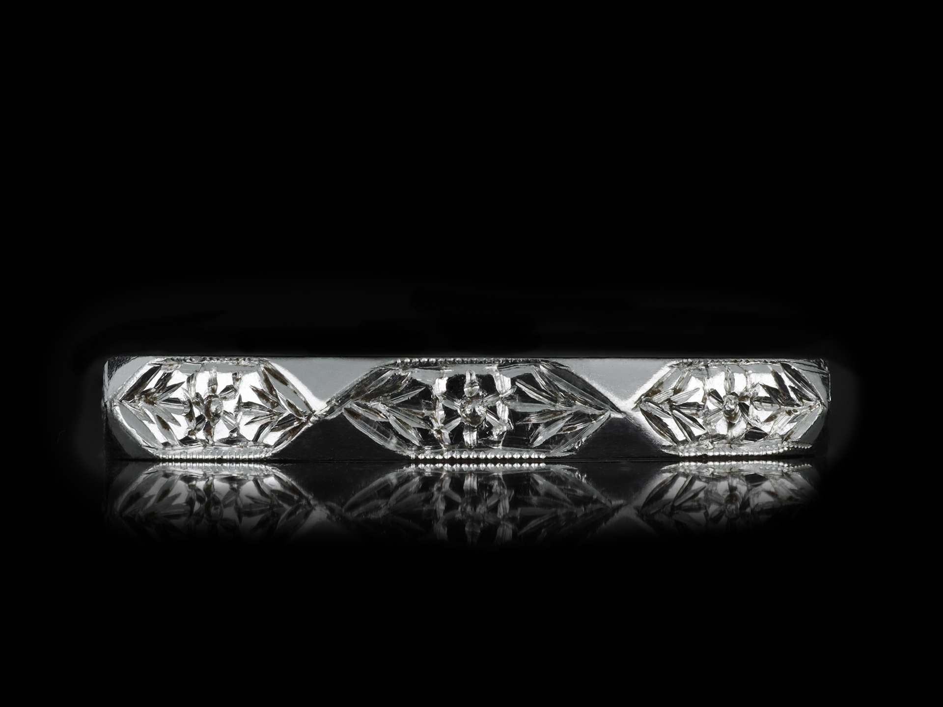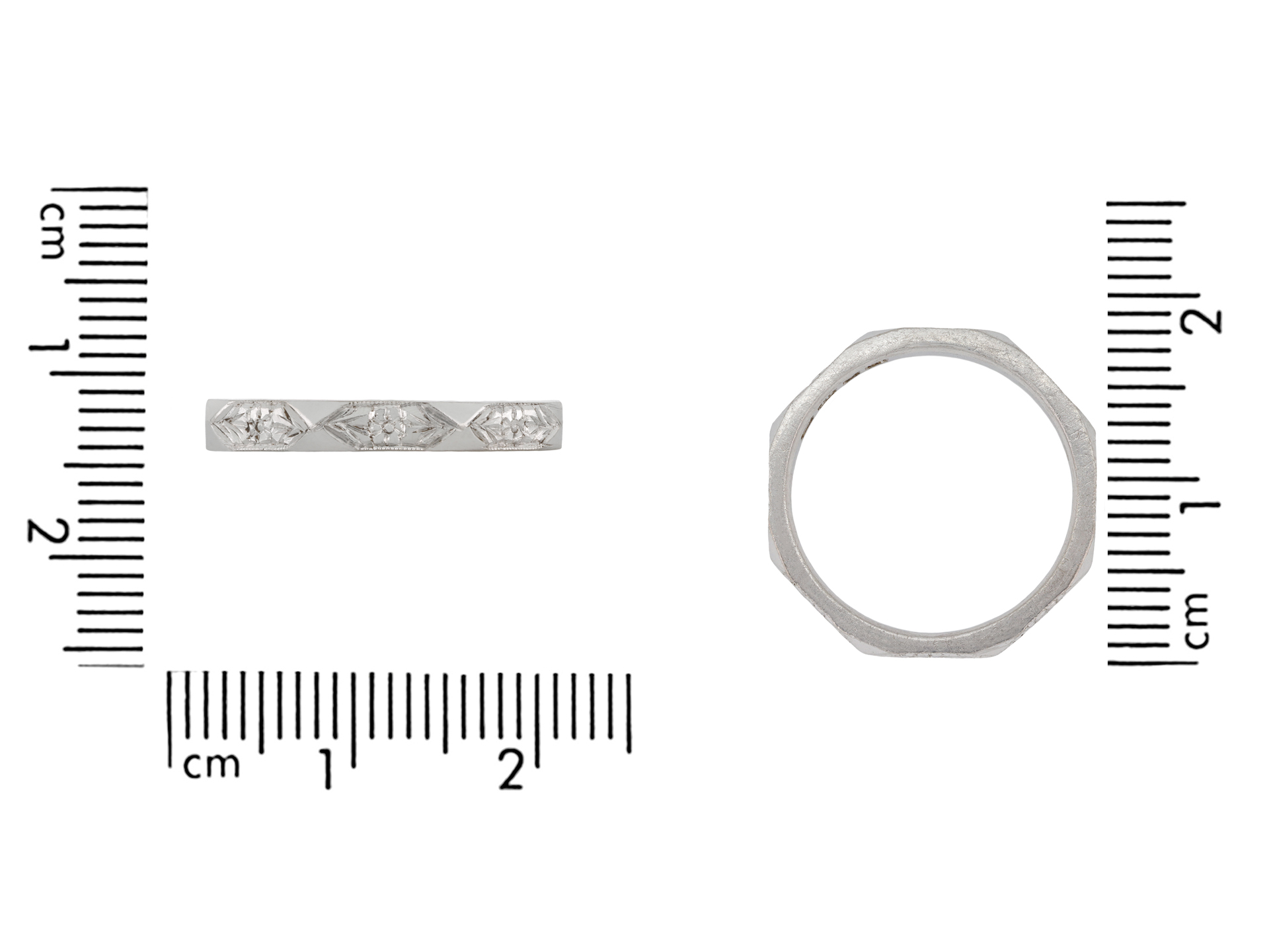 Engraved wedding band. An angular wedding band, faceted around the full circumference, each panel finely engraved with a repeating stylised foliate design with millegrain highlights, approximately 2.7mm in width. Marked 18 carat white gold, approximately 3.32 grams in weight, full hallmarks for London, makers mark 'J.M', English, 1937.