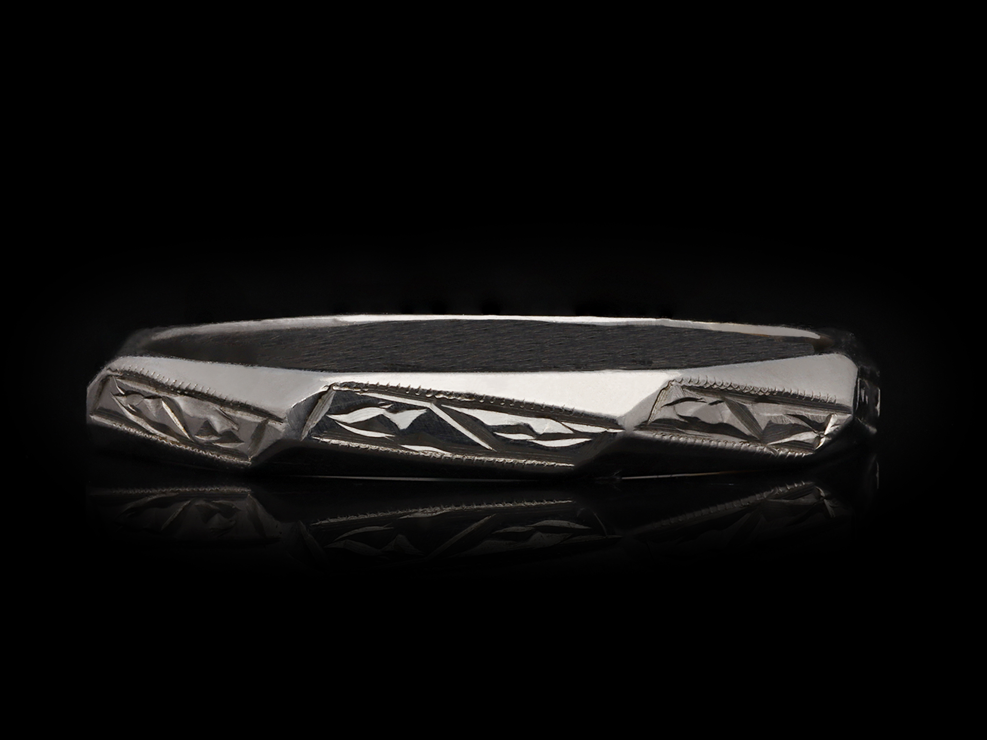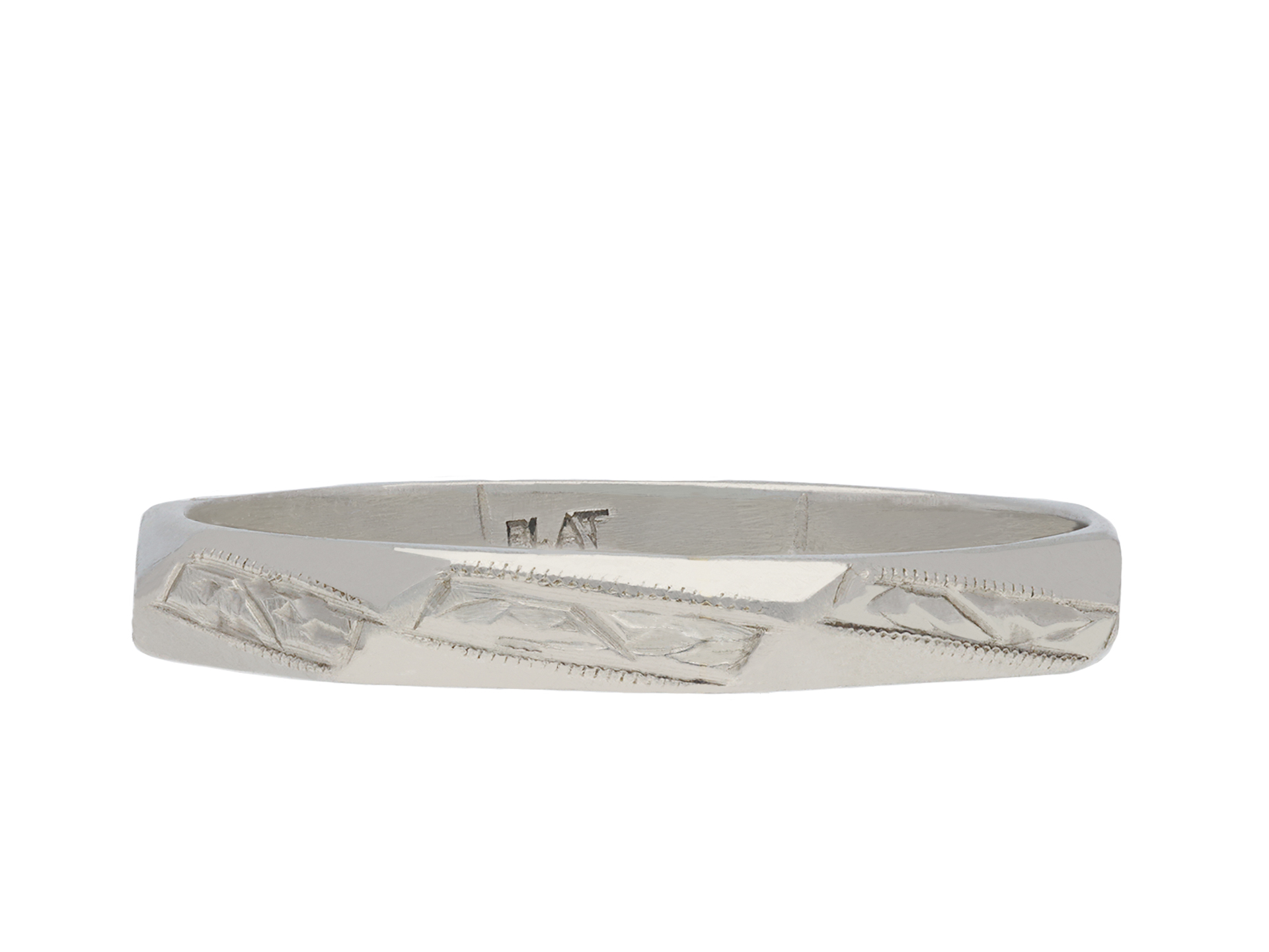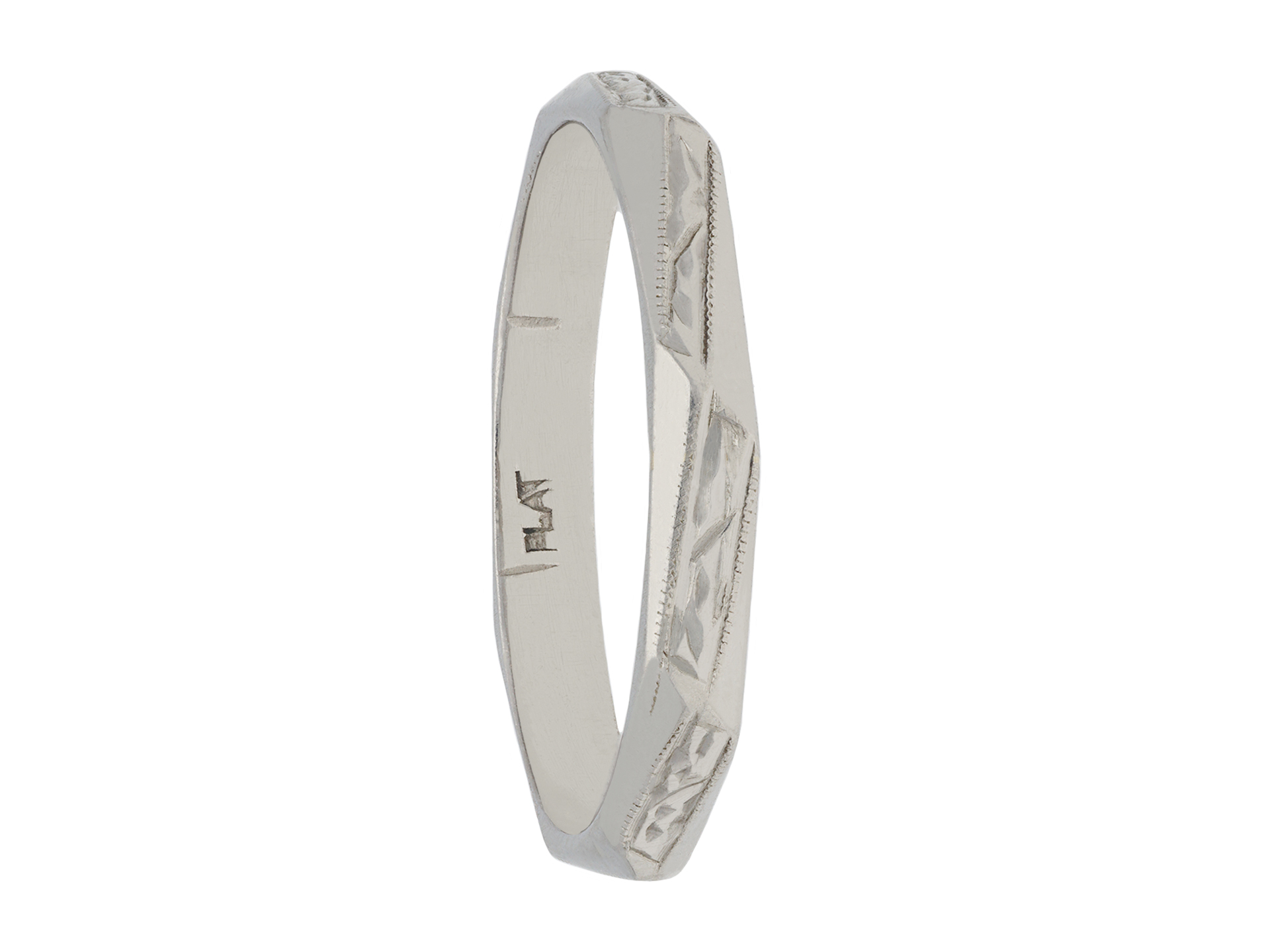 Platinum engraved wedding band. An angular wedding band with octagonal outline, faceted around the full circumference, each panel finely engraved with a repeating abstract linear design with millegrain highlights, approximately 2.8mm in width. Marked platinum, approximately 3.27 grams in weight, circa 1930.