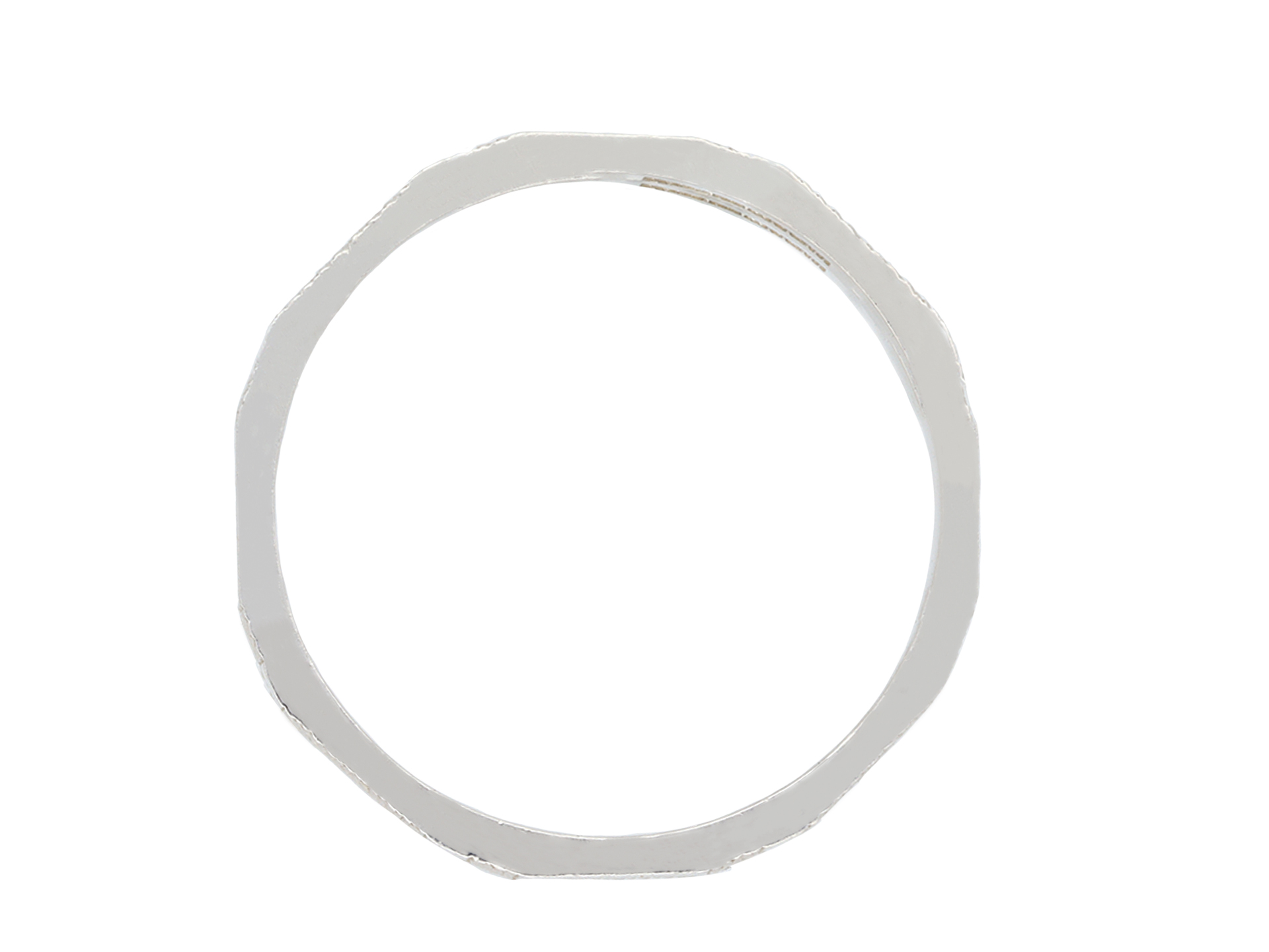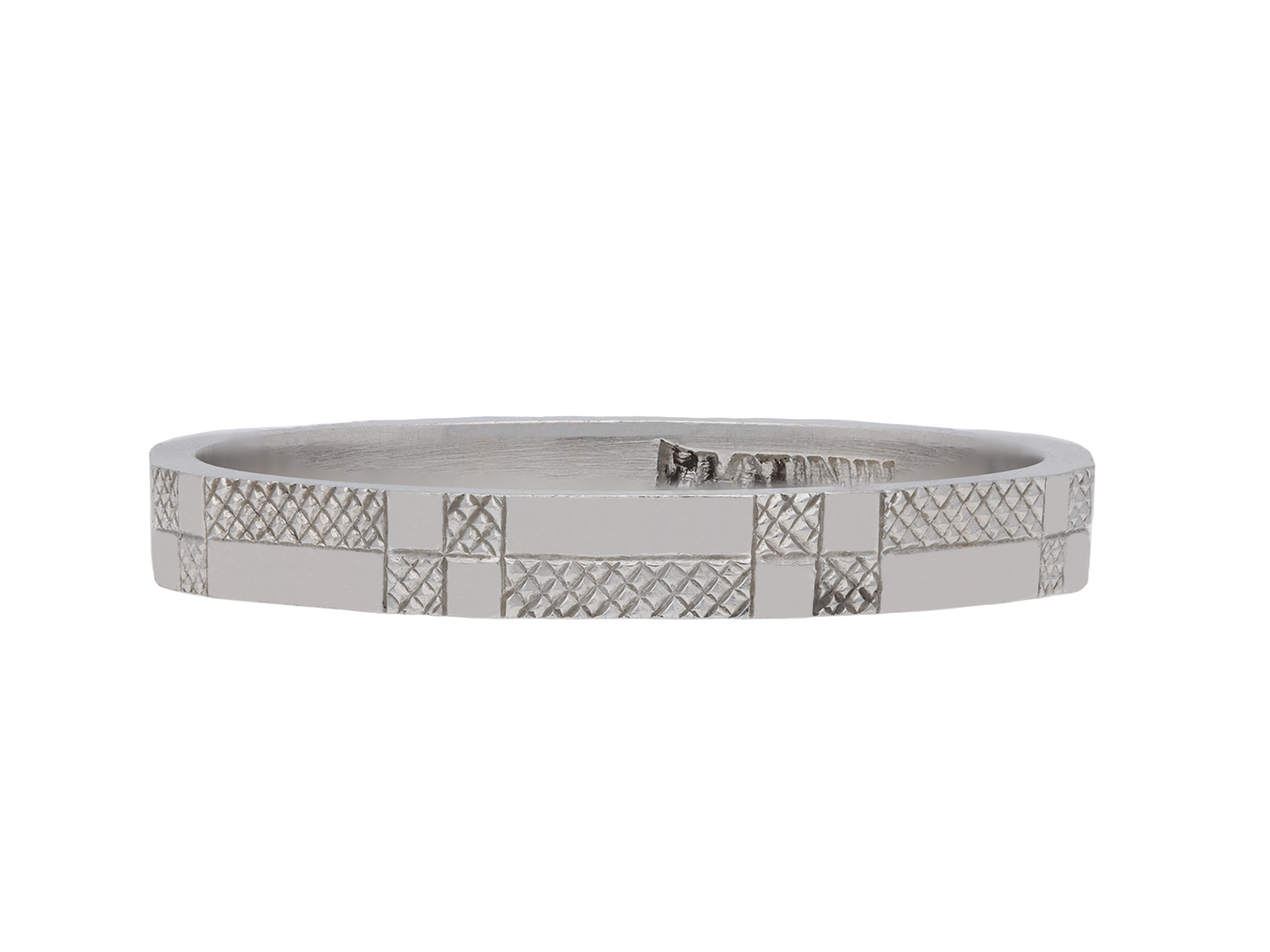 Platinum engraved wedding band. An angular wedding band, faceted around the full circumference, each panel finely engraved with a repeating geometric design, approximately 2.5mm in width. Marked platinum, approximately 2.92 grams in weight, circa 1930.