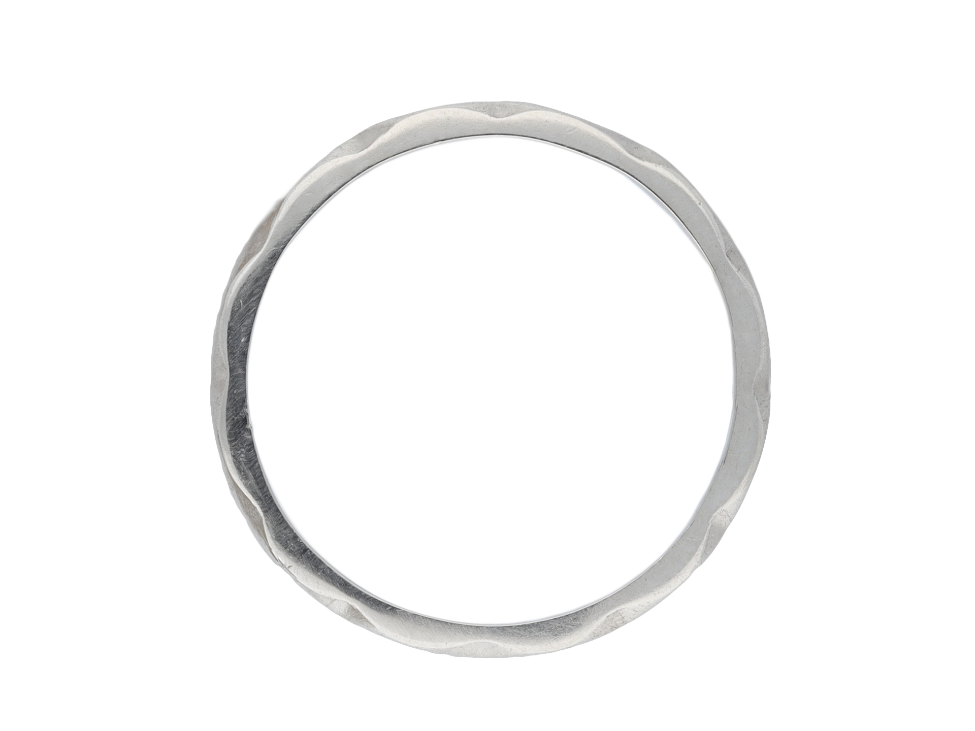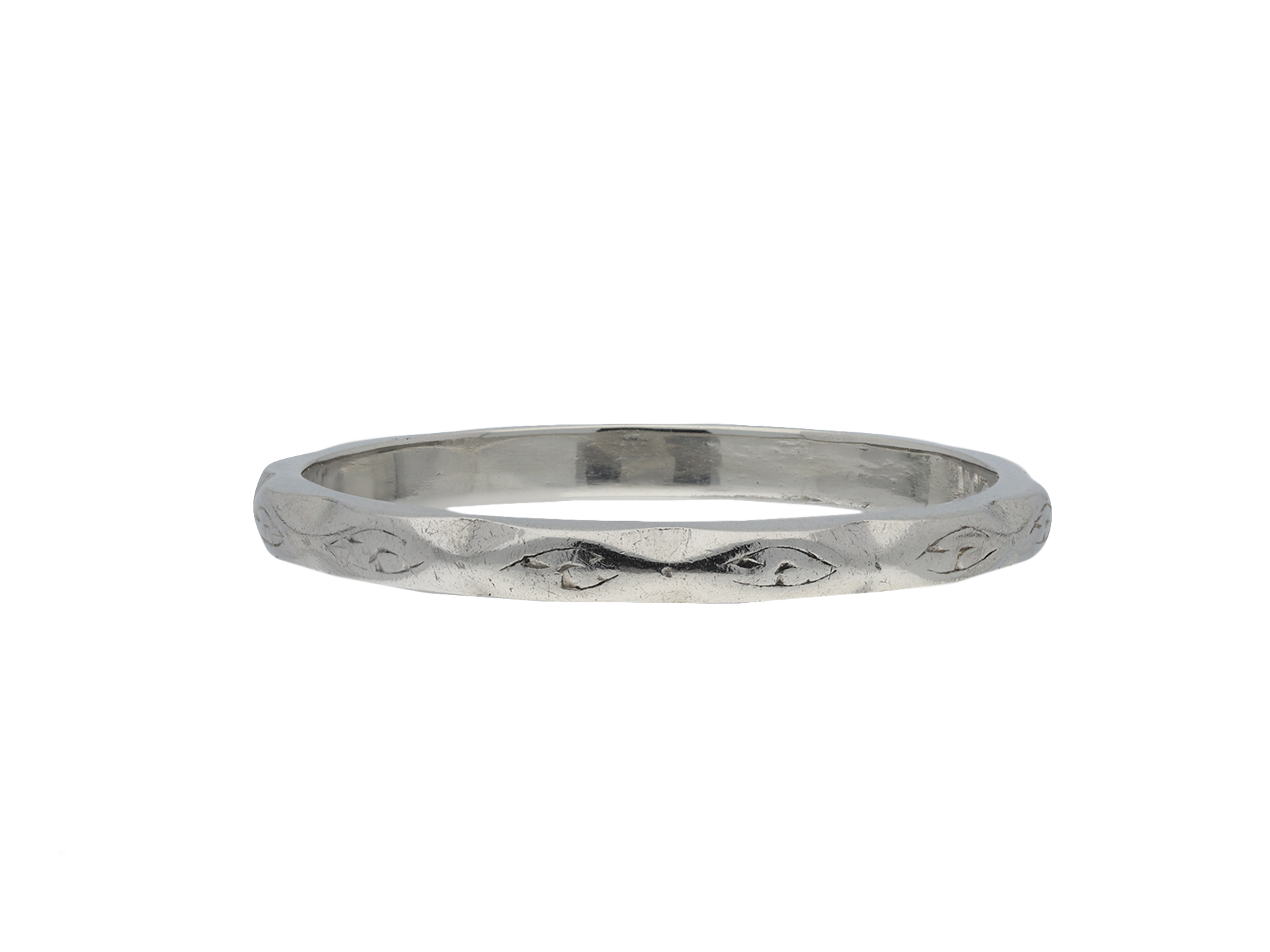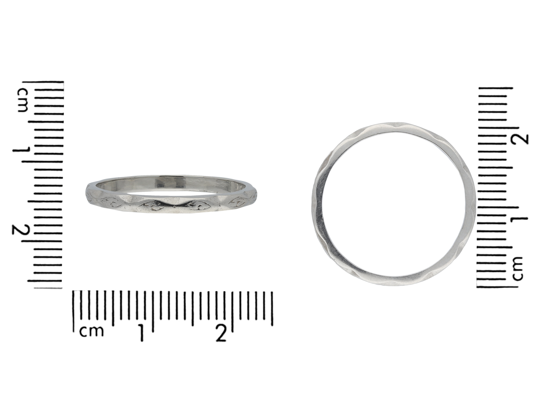 Platinum wedding band. A smoothly conforming band featuring raised faceted details with engraved decoration and polished edging, approximately 2mm in width. Tested platinum, approximately 3.2 grams in weight, circa 1930.
