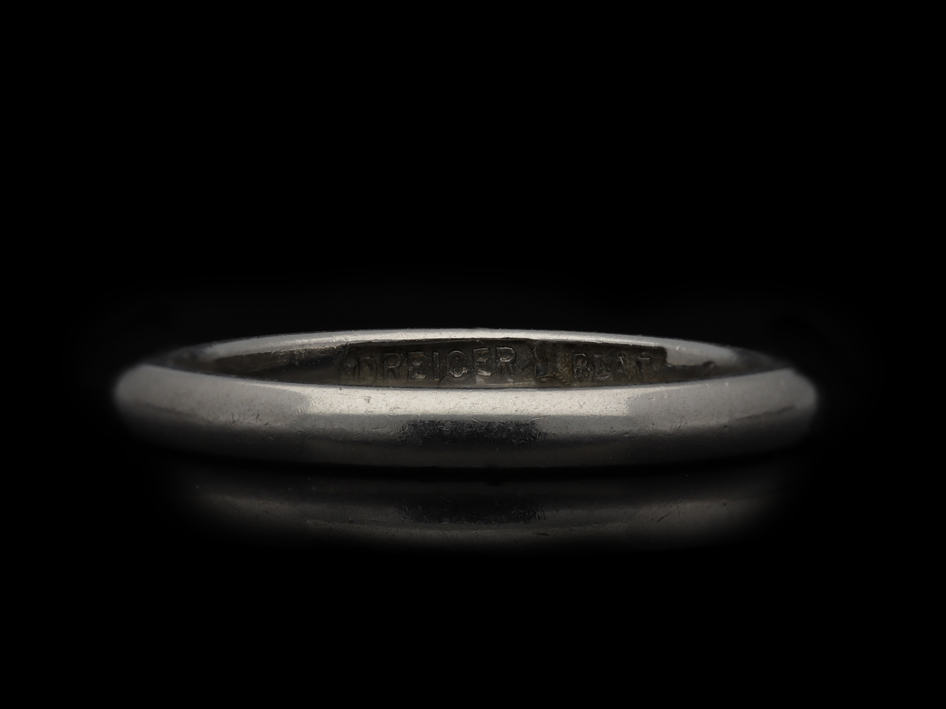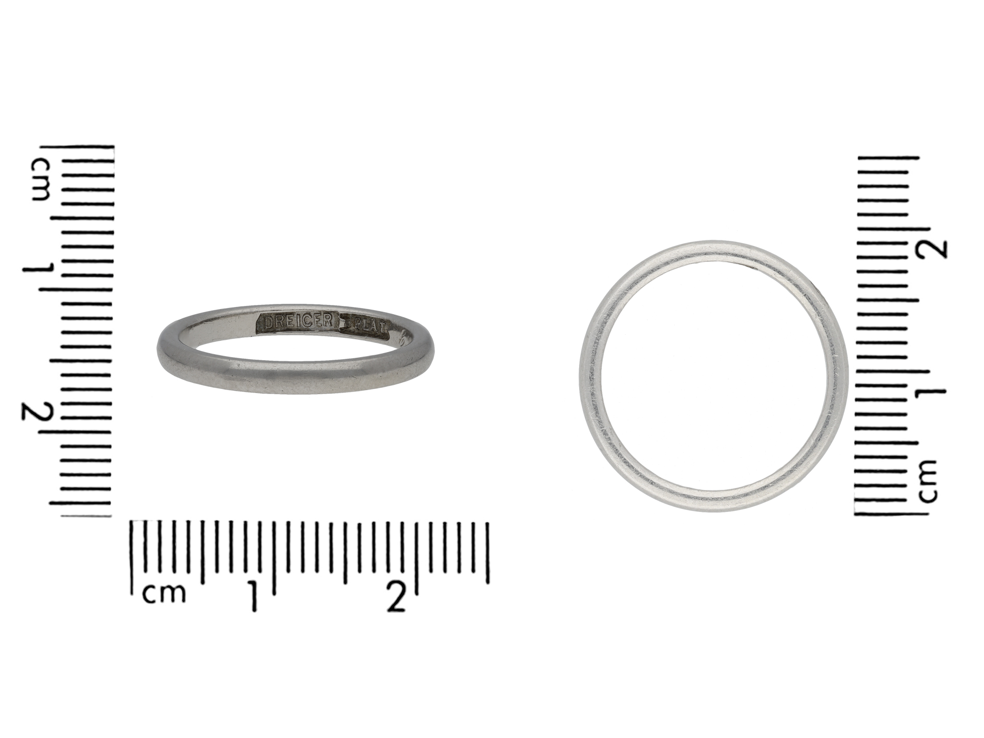 Platinum wedding ring by Dreicer & Co, American, circa 1919. A platinum half round wedding band, approximately 2.2mm in width, and 3.42g in weight, marked DREICER/PLAT.