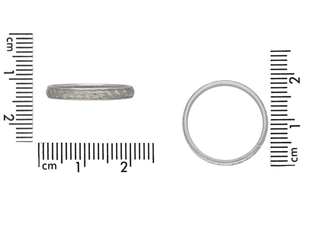 Vintage engraved platinum wedding band. A smoothly conforming wedding band, engraved around the full circumference with a repeating pattern of leaves, with polished borders to top and bottom, approximately 2.5mm in width. Marked platinum, approximately 2.55 grams in weight, circa 1920.