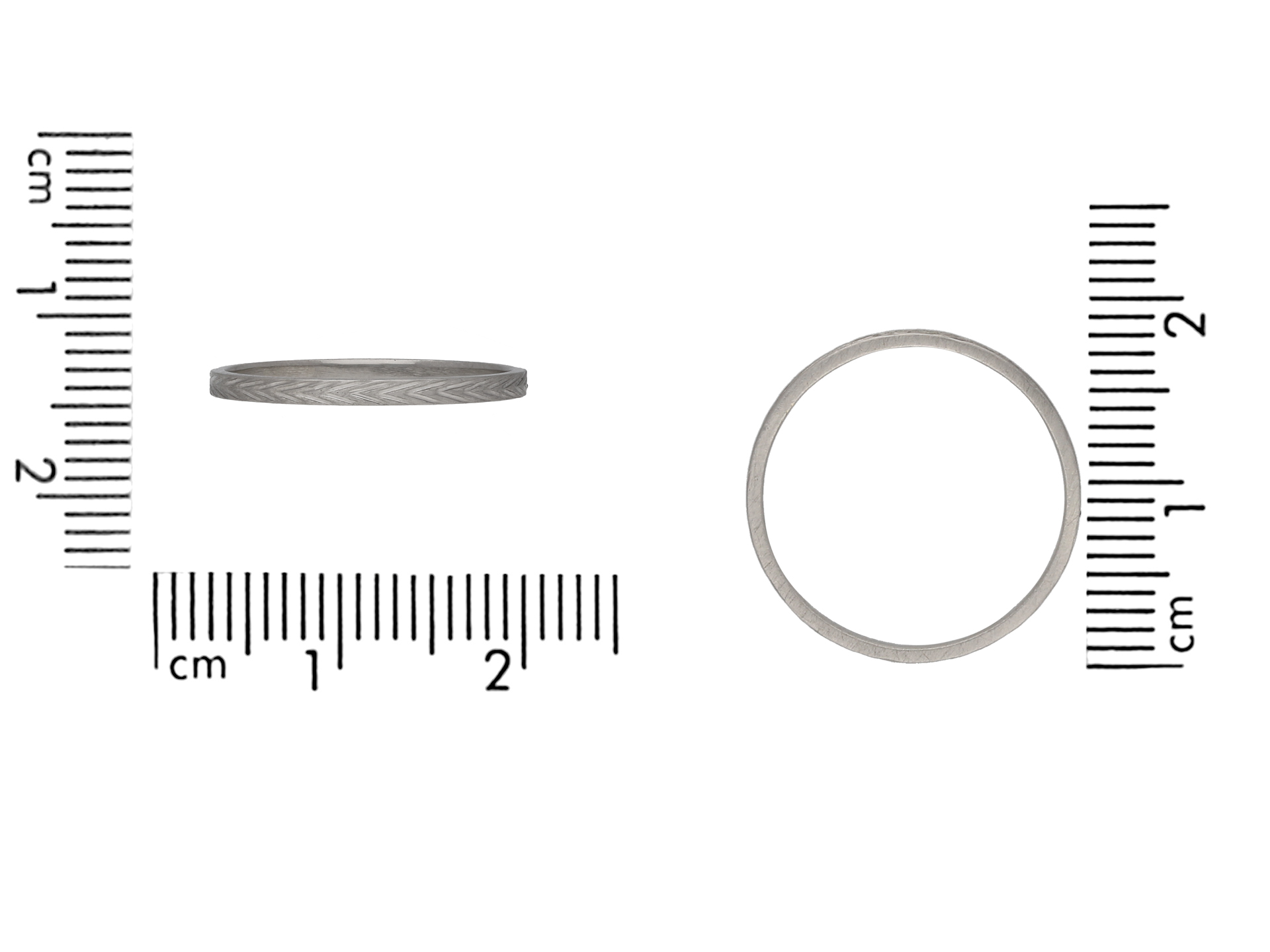 Vintage engraved platinum wedding band. A smoothly conforming wedding band engraved around the full circumference with a repeating stylised chevron motif, approximately 1.6mm in width. Tested platinum, approximately 1.40 grams in weight, circa 1960.