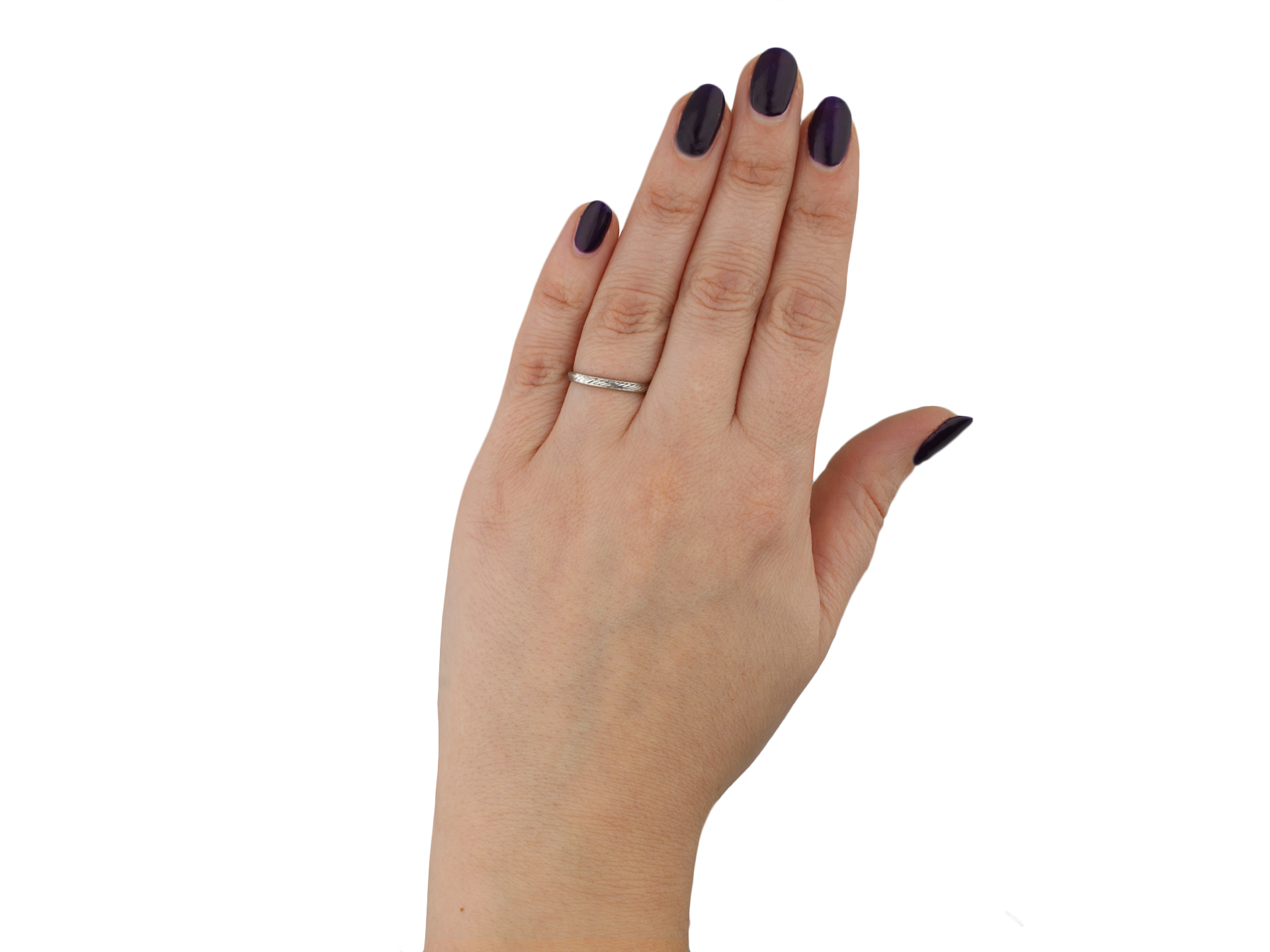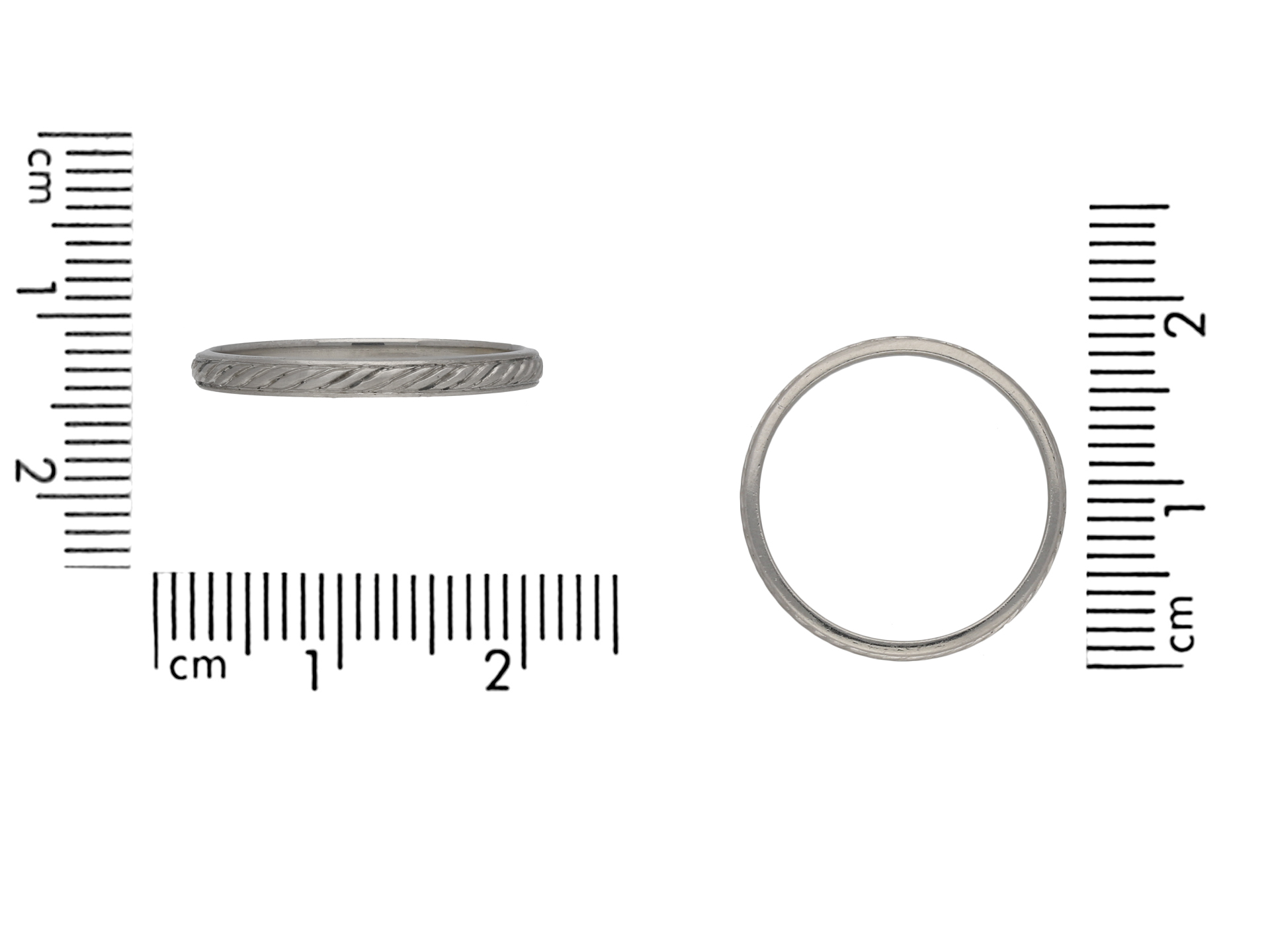 Vintage platinum engraved wedding band. A smoothly conforming wedding band, engraved around the full circumference with a repeating linear pattern, approximately 2.00mm in width. Tested platinum, approximately 1.96 grams in weight, circa 1950.