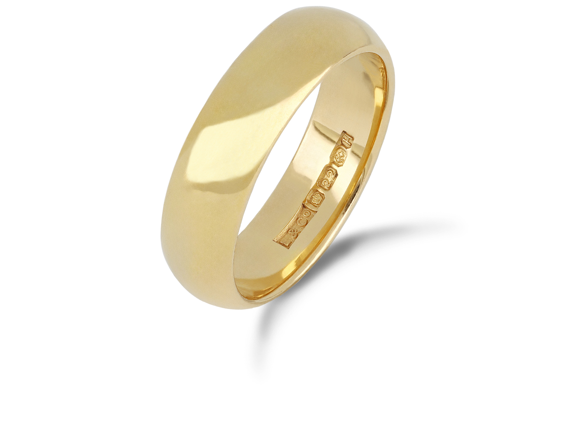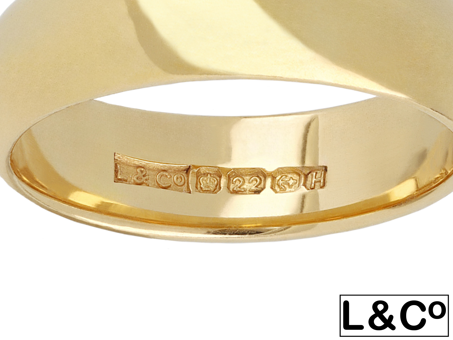 Yellow gold wedding band. A smoothly conforming D-shaped wedding band, approximately 5.0mm in width. Marked 22 carat yellow gold, approximately 5.70 grams in weight, maker's mark 'L&Co.’, full hallmarks for Birmingham, English, 1957.