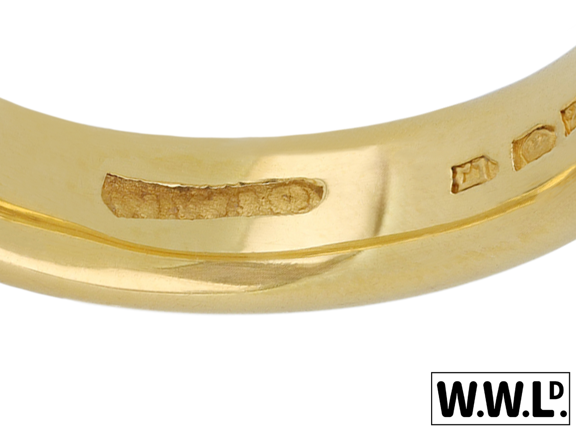 Yellow gold wedding band. A smoothly conforming court shape wedding band, approximately 4.5mm in width. Marked 22 carat yellow gold, approximately 9.42 grams in weight, maker's mark 'W.W.Ld' for W Wilkinson Limited, full hallmarks for London, English, 1918.