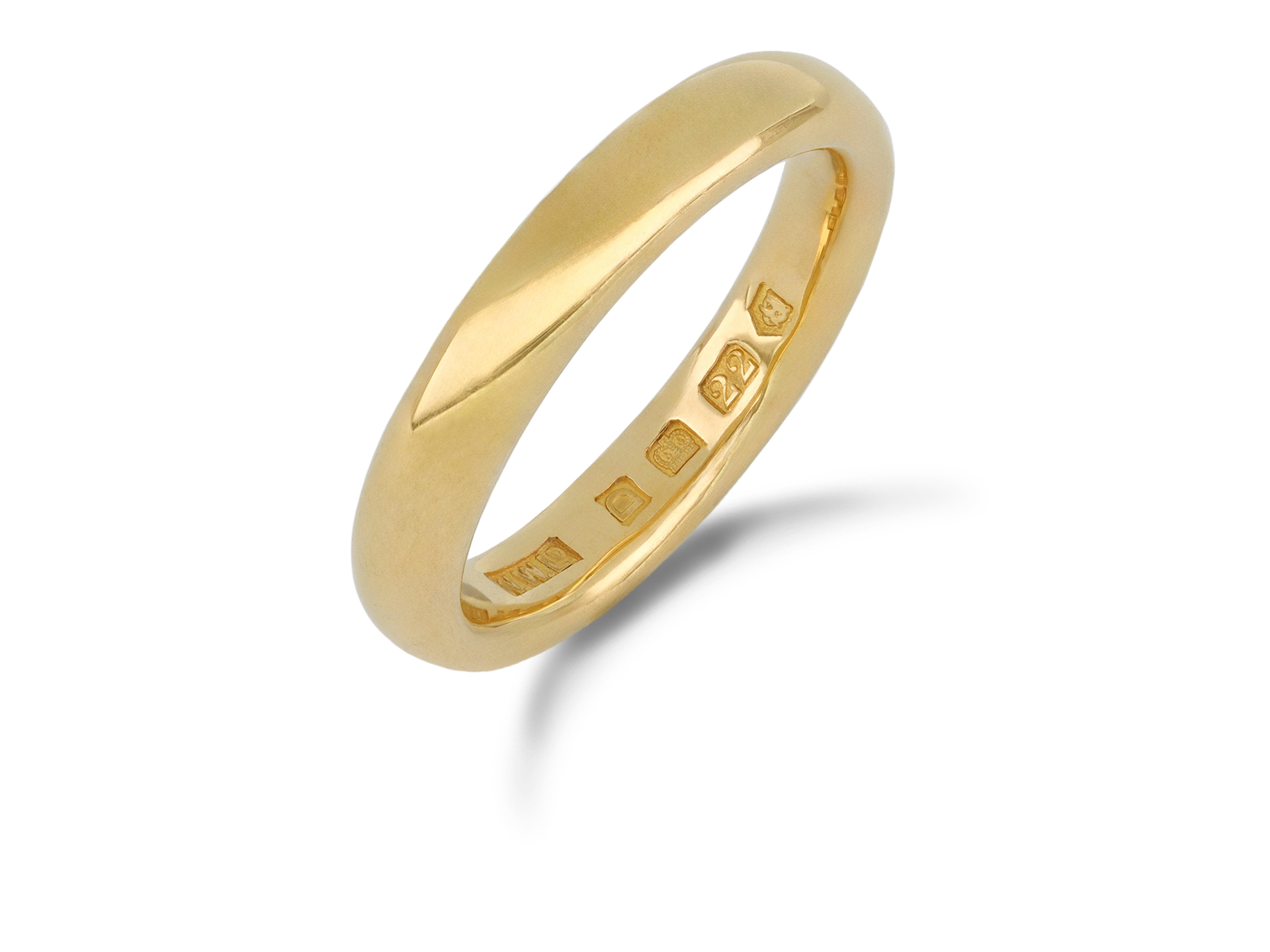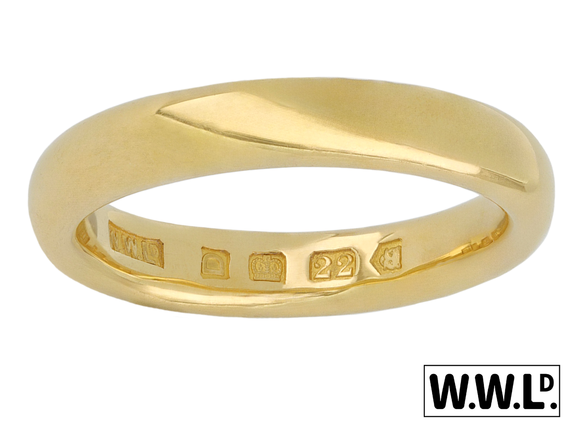 Yellow gold wedding band. A smoothly conforming court shape wedding band, approximately 3.5mm in width. Marked 22 carat yellow gold, approximately 6.15 grams in weight, maker's mark 'W.W.Ld' for W Wilkinson Limited, full hallmarks for London, English, 1939.