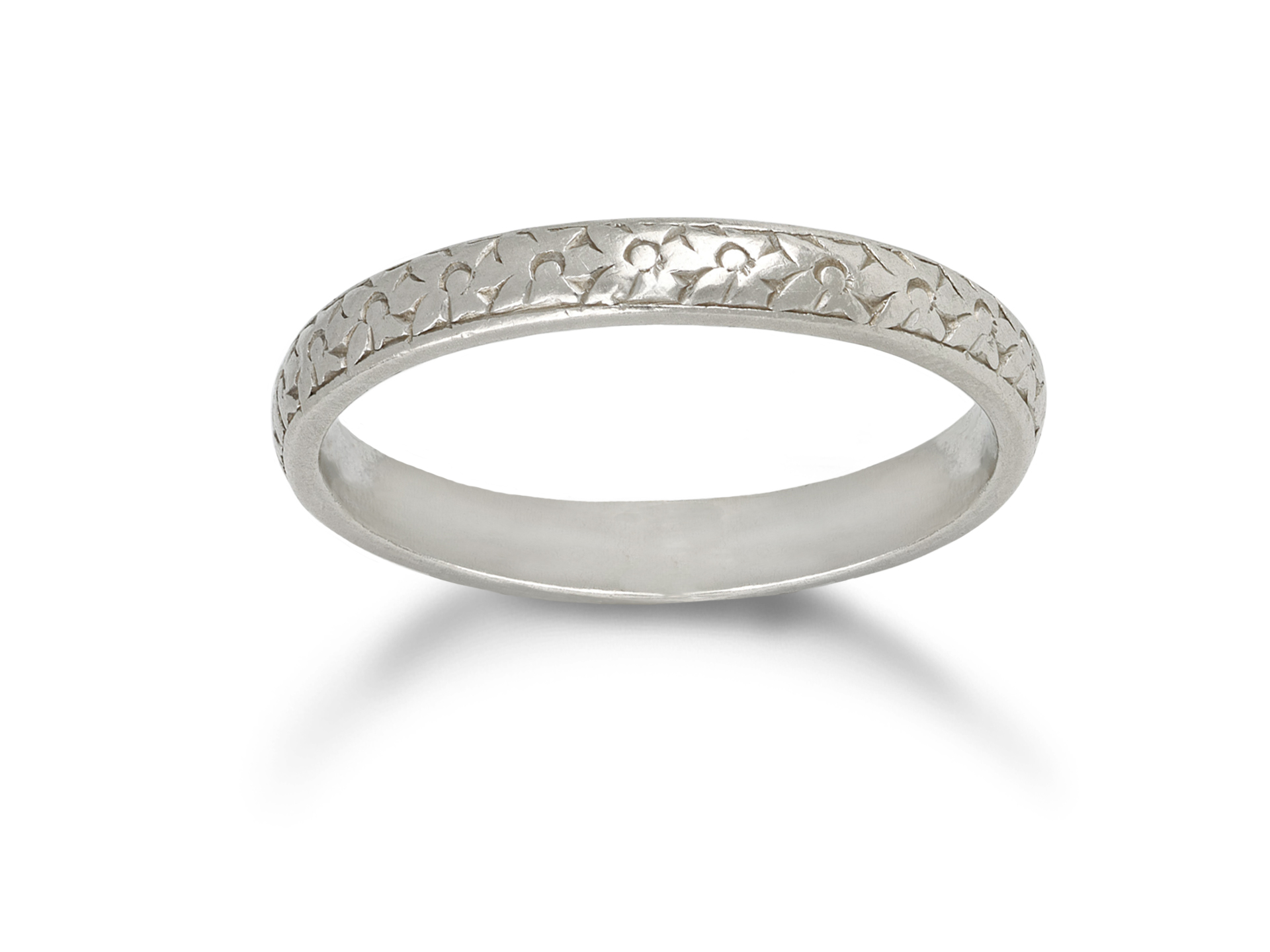 Engraved wedding band. A smoothly conforming D-shape wedding band featuring an engraved stylised flower pattern around the full circumference, approximately 3.0 mm in width. Tested platinum, approximately 4.83 grams in weight, circa 1920.