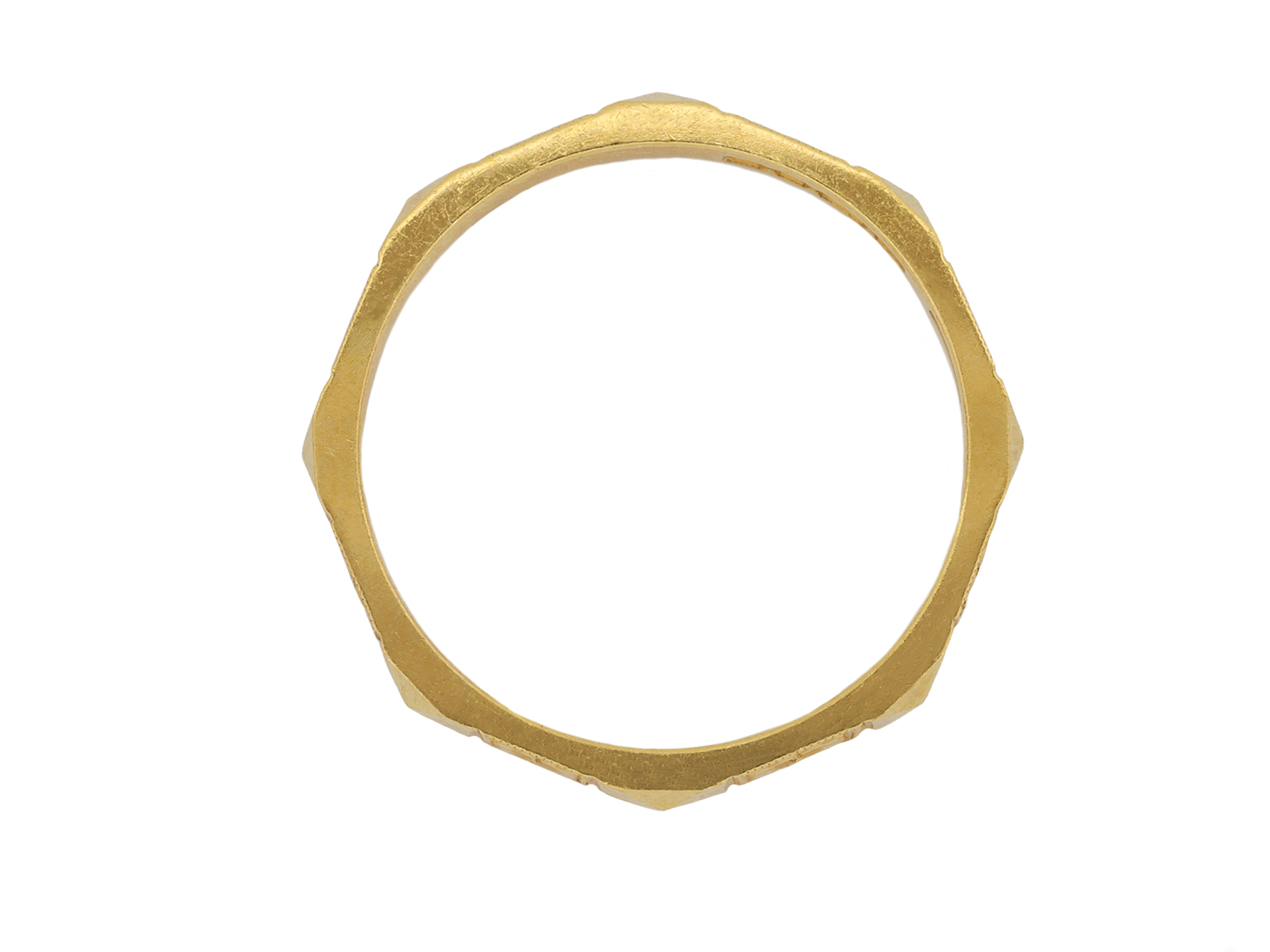 Engraved yellow gold wedding band. A smoothly conforming flat band featuring engraved floral decoration faceted around the full circumference, pyramidal detail, and polished edges, approximately 2.8mm in width. Marked 22 carat yellow gold, approximately 3.71 grams in weight, makers mark 'W&A.G', full hallmarks for London, English, 1953.