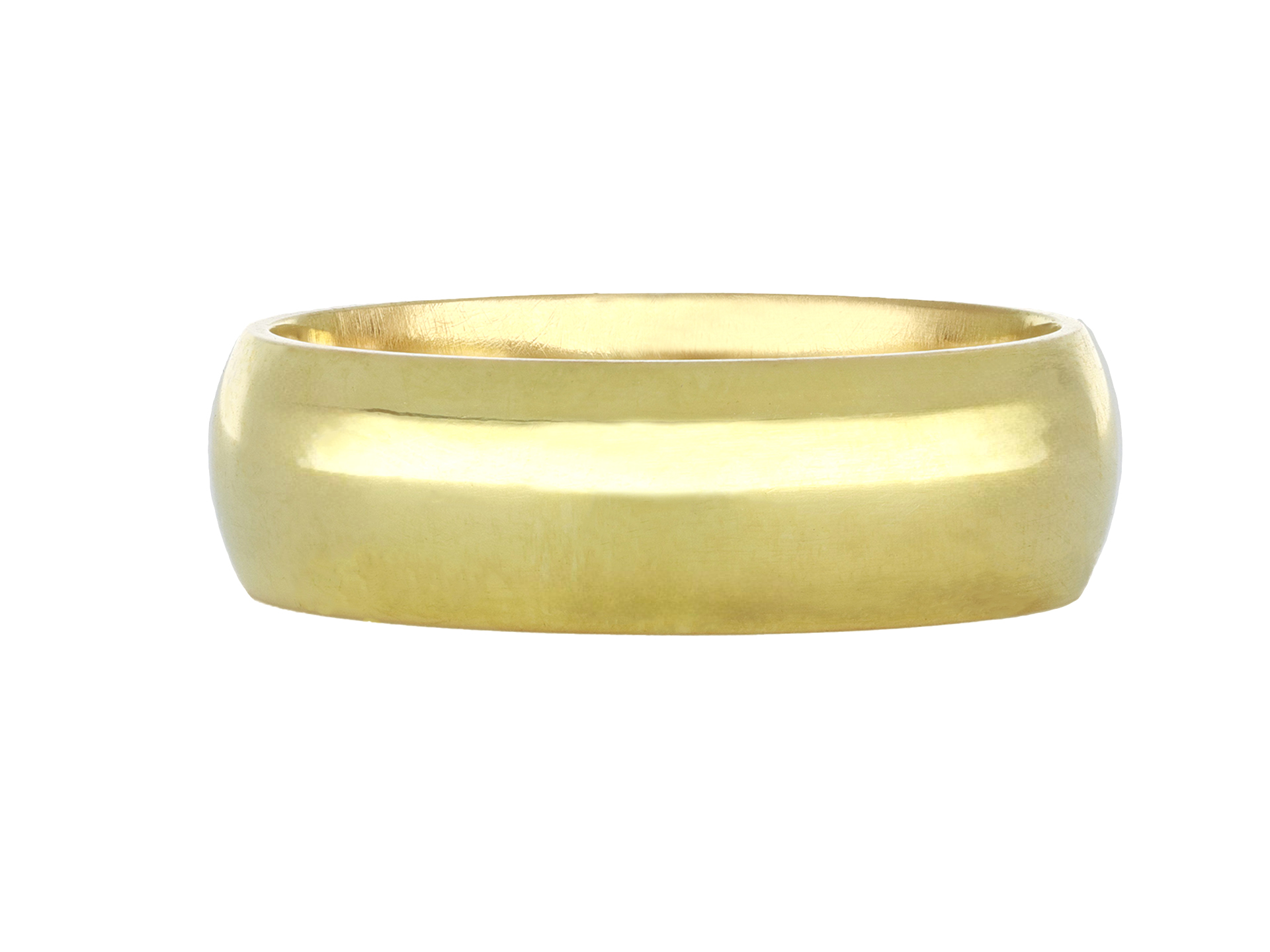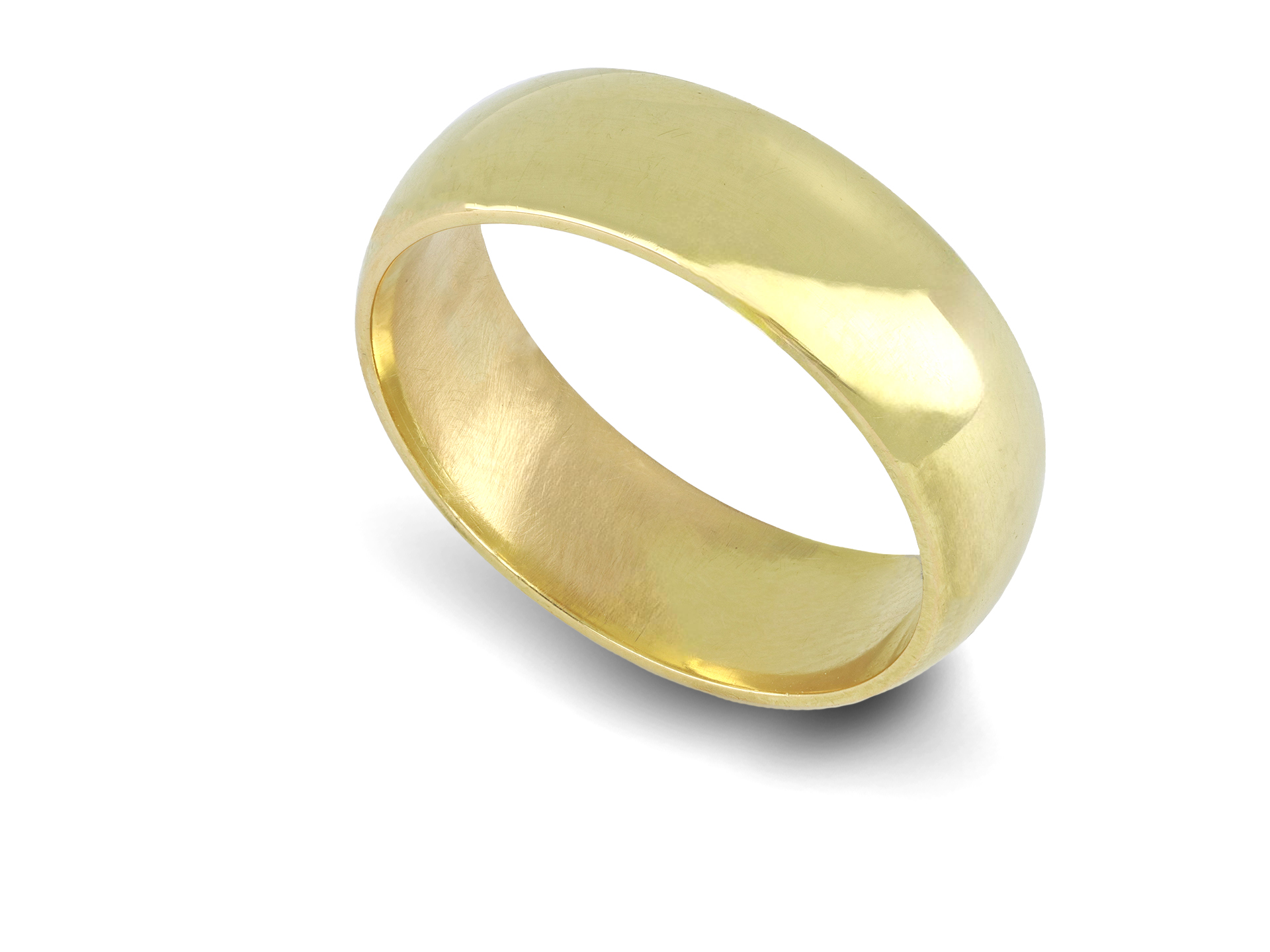 Yellow gold wedding band. A smoothly conforming D-shape wedding band with polished edges, approximately 7 mm in width. Tested 18 carat yellow gold, approximately 13.9 grams in weight, circa 1970.