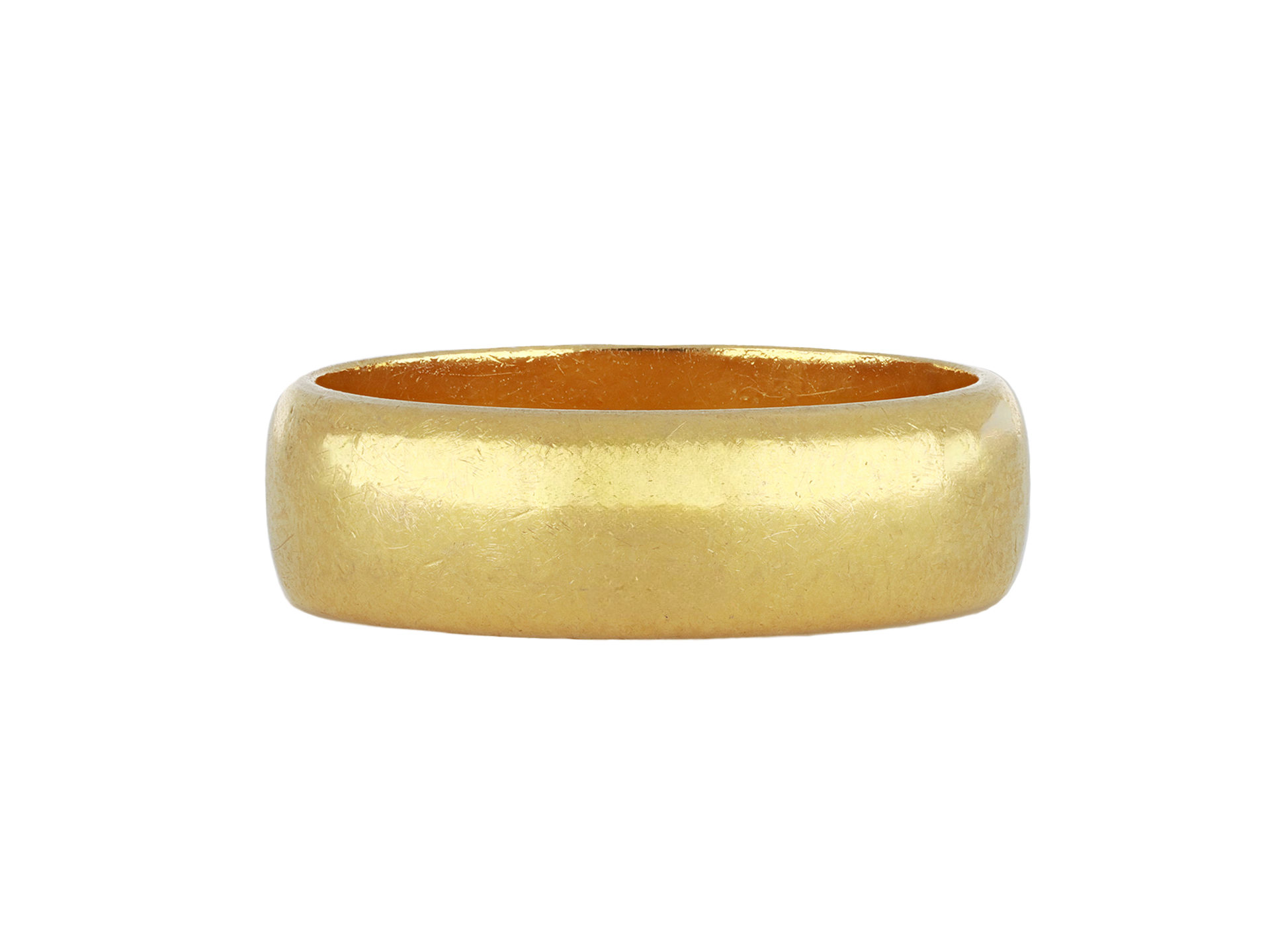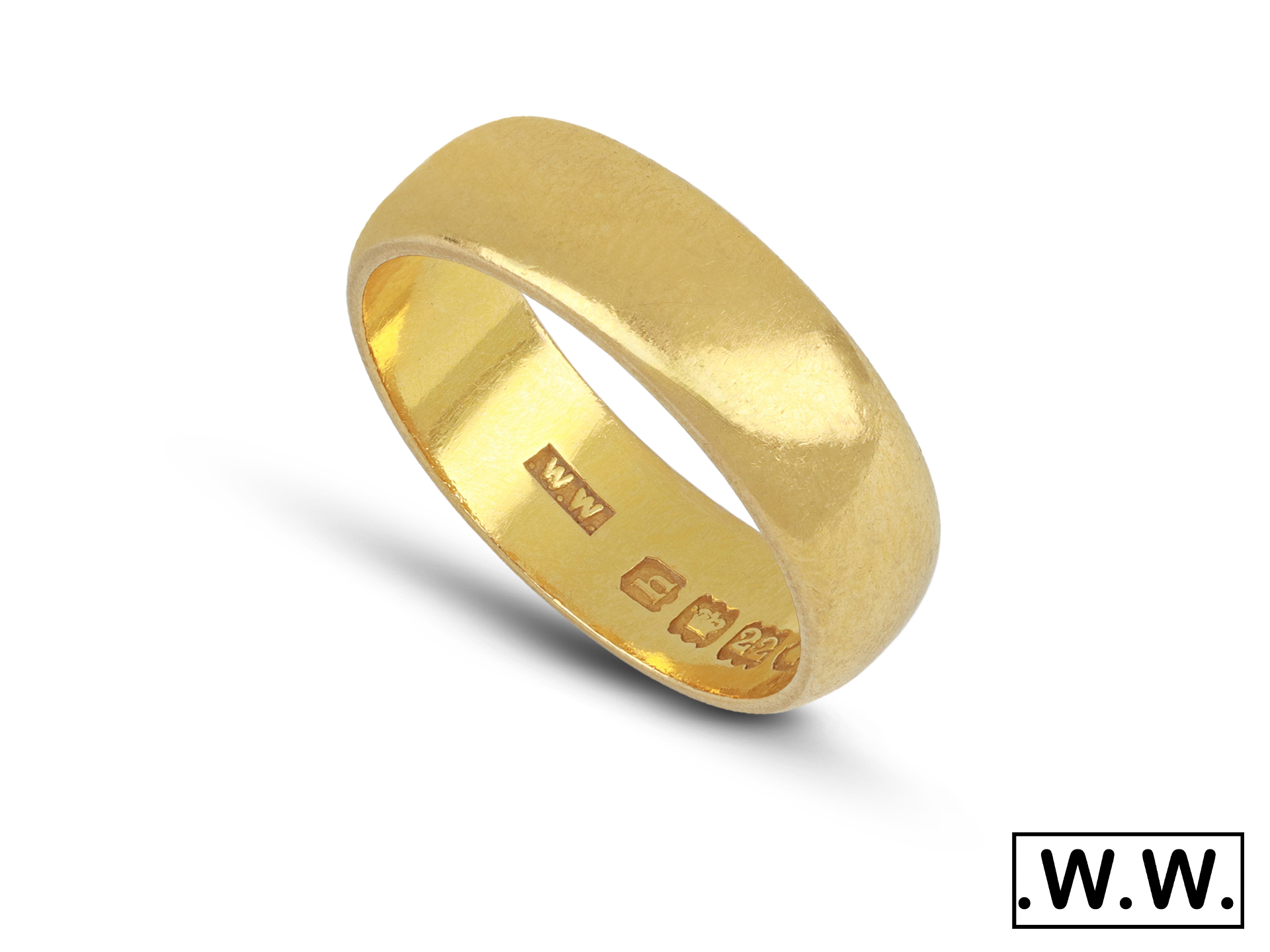Yellow gold wedding band. A smoothly conforming D shape wedding band with polished edges, approximately 5.8mm in width. Marked 22 carat yellow gold, approximately 6.62 grams in weight, maker's mark 'WW' for William Wilkinson, full hallmarks for London, English, 1903.