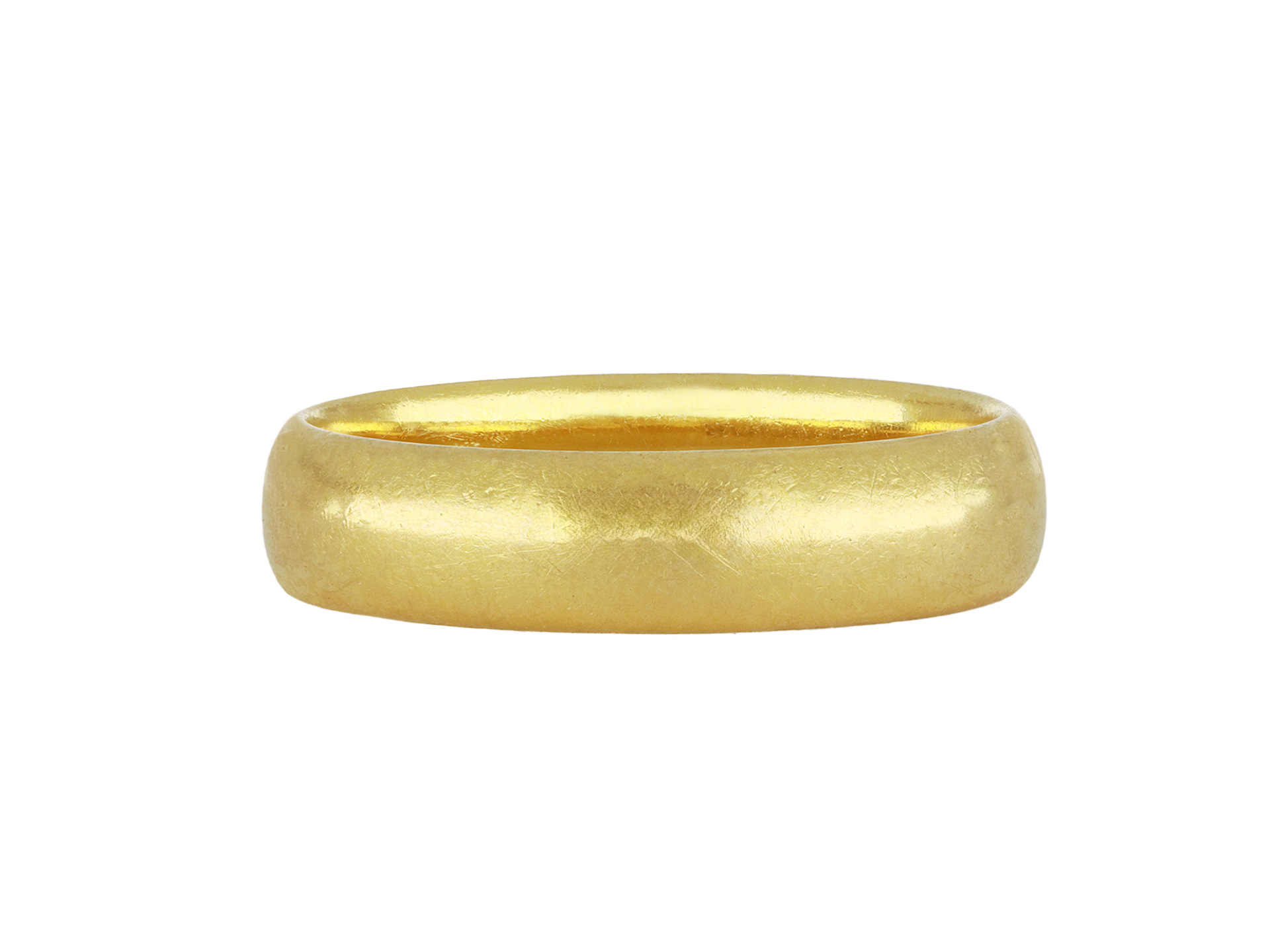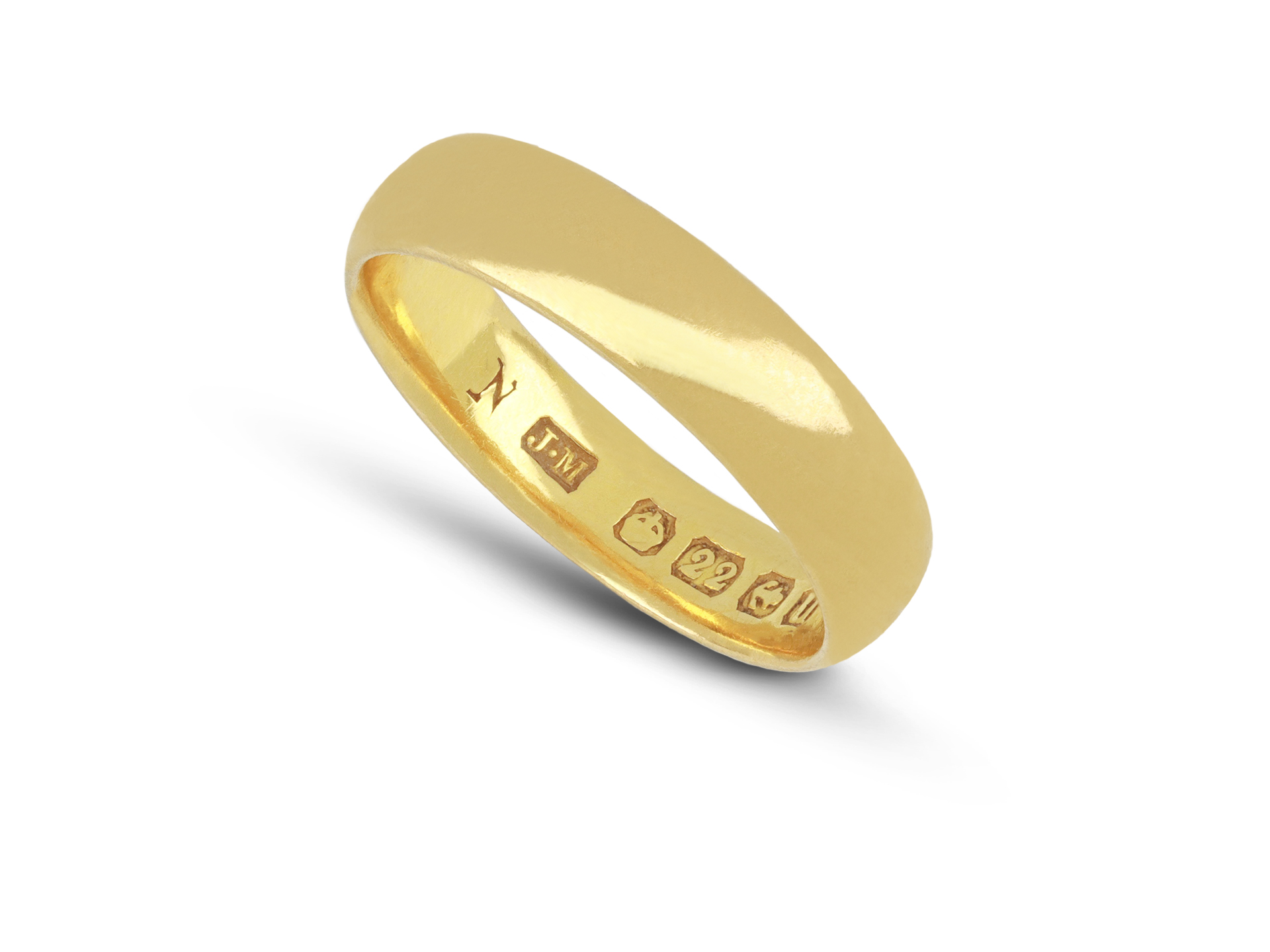Yellow gold wedding band. A smoothly conforming court shape wedding band with polished edges, approximately 4.4 mm in width. Marked 22 carat yellow gold, approximately 4.77 grams in weight, maker's mark 'J.M', full hallmarks for Birmingham, English, 1919.