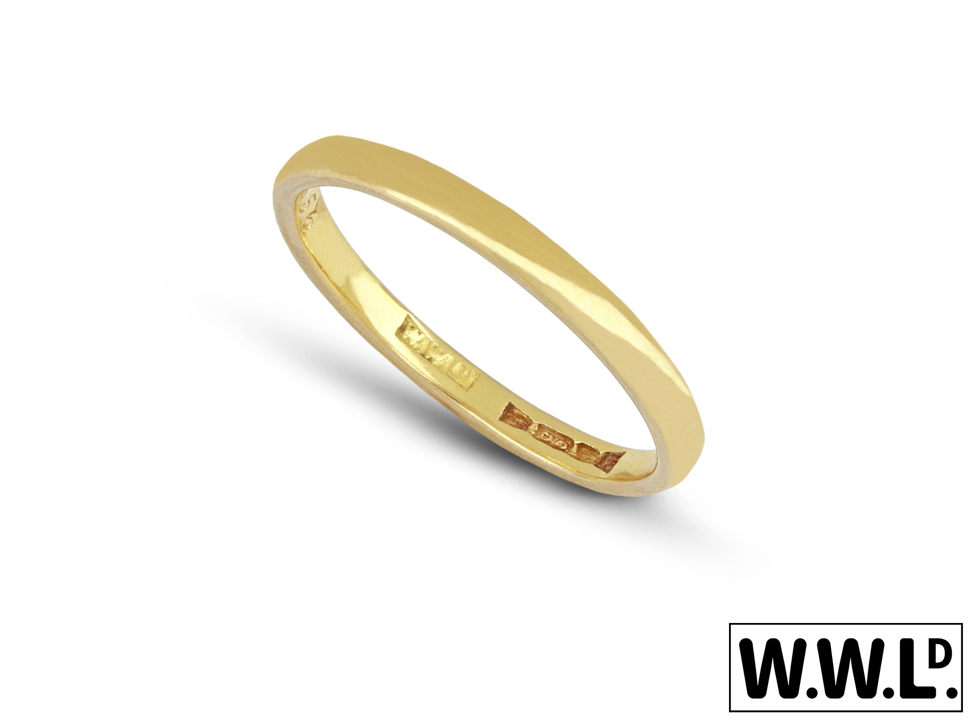 Yellow gold wedding band. A smoothly conforming D shape wedding band with polished edges, approximately 2.2mm in width. Marked 22 carat yellow gold, approximately 7.04 grams in weight, maker's mark 'WWLD' for William Wilkinson Limited, engraved to interior 'J.B.B - M.A.P 22.9.56', full hallmarks for London, English, 1956.