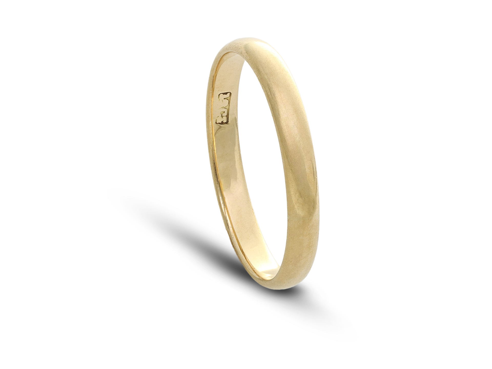 Yellow gold wedding band. A smoothly conforming D-shape wedding band with polished edges, approximately 3mm in width. Marked 18 carat yellow gold, approximately 1.99 grams in weight, circa 1950.